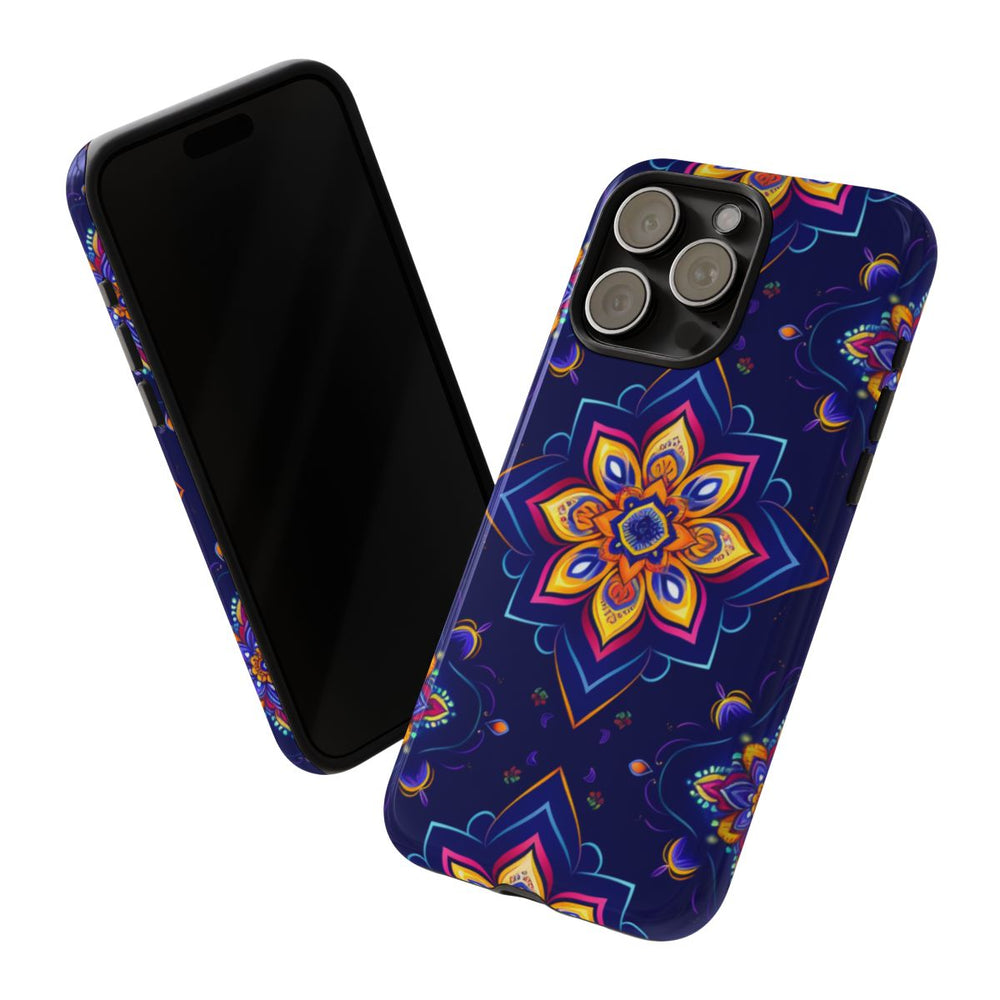 Dit hoesje heeft een naadloos patroon van levendige mandala’s met bloemmotieven op een donkerblauwe achtergrond. De mandala’s bestaan uit verfijnde vormen en opvallende kleuren zoals oranje, geel, roze, blauw en paars. Het symmetrische patroon loopt door, waardoor een sierlijk geheel ontstaat. Het hoesje heeft een glanzende afwerking en is stevig dankzij de dubbele laag, wat zorgt voor extra bescherming en duurzaamheid. Geschikt voor draadloos opladen en bestand tegen invloeden van buitenaf.
