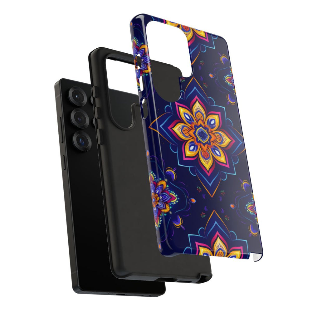 Dit hoesje heeft een naadloos patroon van levendige mandala’s met bloemmotieven op een donkerblauwe achtergrond. De mandala’s bestaan uit verfijnde vormen en opvallende kleuren zoals oranje, geel, roze, blauw en paars. Het symmetrische patroon loopt door, waardoor een sierlijk geheel ontstaat. Het hoesje heeft een glanzende afwerking en is stevig dankzij de dubbele laag, wat zorgt voor extra bescherming en duurzaamheid. Geschikt voor draadloos opladen en bestand tegen invloeden van buitenaf.