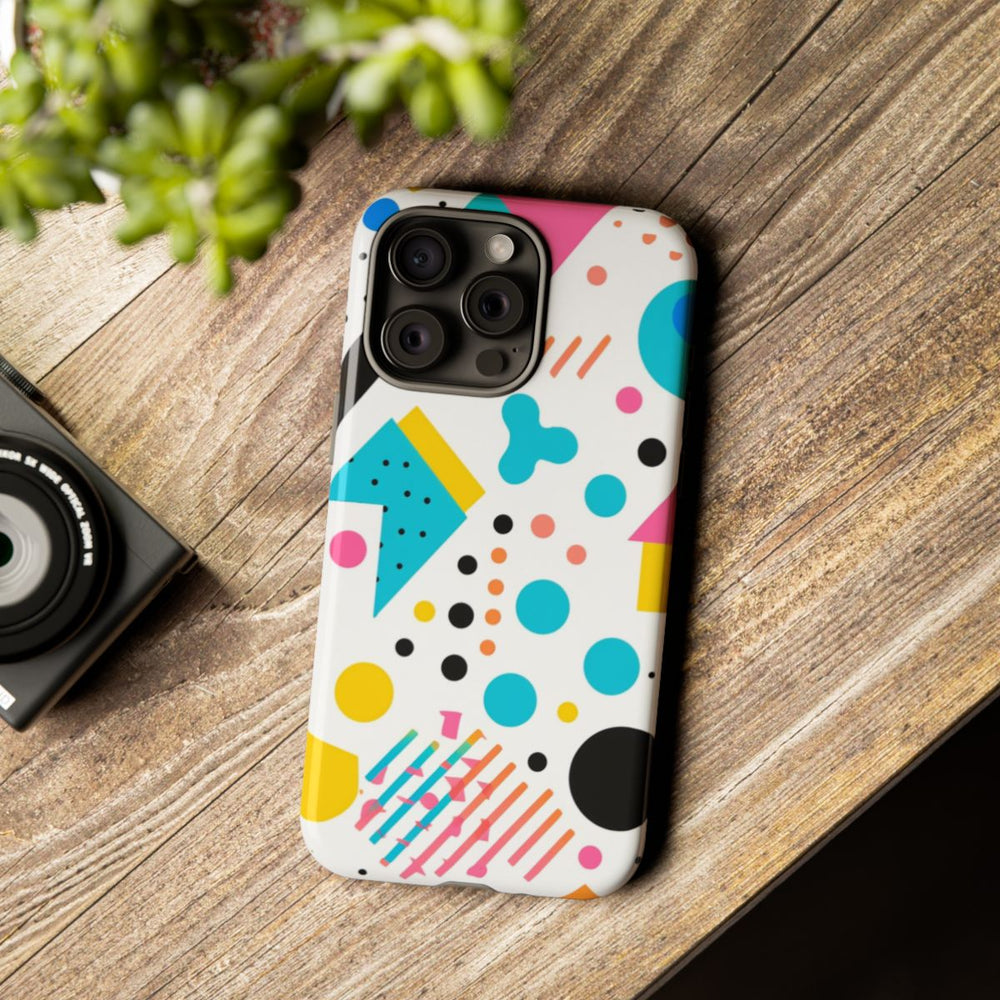 Dit hoesje heeft een opvallend Memphis stijlpatroon met diverse geometrische vormen zoals cirkels, driehoeken, rechthoeken en abstracte figuren. De vormen zijn ingevuld met heldere kleuren zoals roze, geel, turquoise, blauw, oranje, zwart en perzik op een witte achtergrond. Het patroon bevat stippen en strepen, wat zorgt voor een speels en dynamisch effect. Het hoesje is glanzend en stevig, gemaakt van een polycarbonaat buitenkant en een TPU binnenzijde. Dit zorgt voor goede bescherming en het hoesje is geschikt voor draadloos opladen.