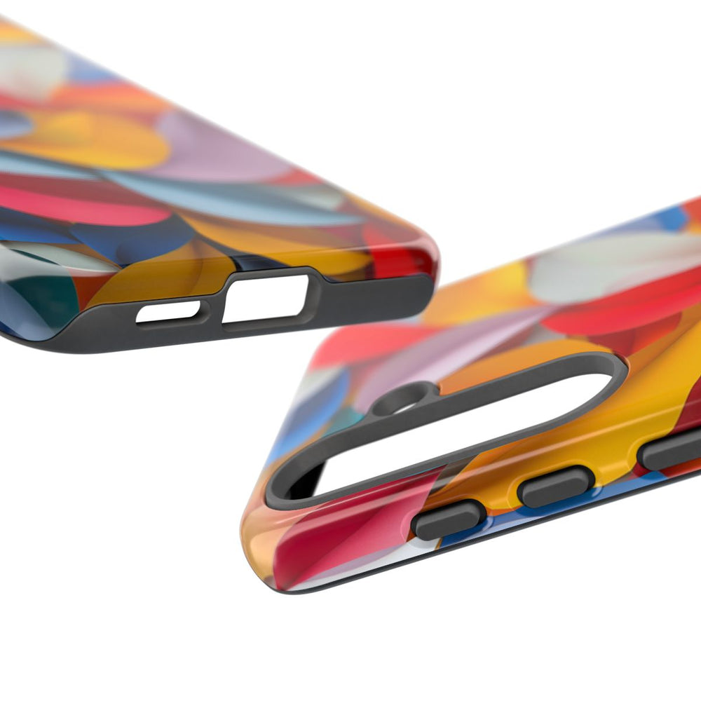 Dit telefoonhoesje is voorzien van een abstract patroon met overlappende vormen die doen denken aan bladeren of bloemblaadjes, alsof ze uit papier zijn gesneden. De vloeiende, gebogen vormen zijn in lagen aangebracht, wat zorgt voor diepte en een levendige uitstraling. Het kleurenpalet bestaat uit heldere tinten geel, rood, blauw, oranje, roze en teal, met een subtiele papierstructuur die zichtbaar is op de oppervlakken. Het hoesje heeft een glanzende afwerking en bestaat uit twee lagen voor extra stevigheid en bescherming. Ondersteunt draadloos opladen.