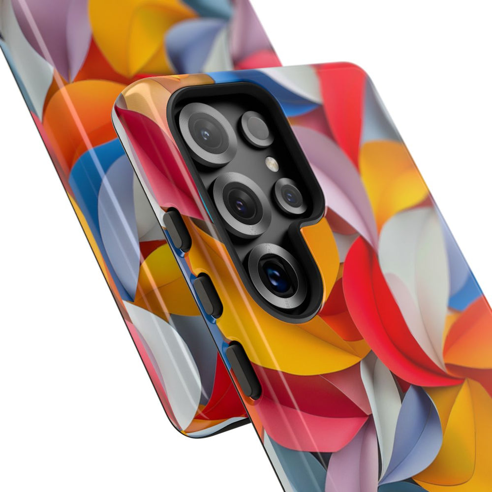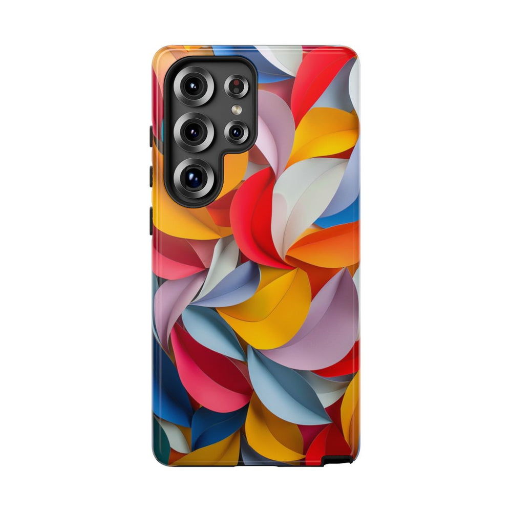 Dit telefoonhoesje is voorzien van een abstract patroon met overlappende vormen die doen denken aan bladeren of bloemblaadjes, alsof ze uit papier zijn gesneden. De vloeiende, gebogen vormen zijn in lagen aangebracht, wat zorgt voor diepte en een levendige uitstraling. Het kleurenpalet bestaat uit heldere tinten geel, rood, blauw, oranje, roze en teal, met een subtiele papierstructuur die zichtbaar is op de oppervlakken. Het hoesje heeft een glanzende afwerking en bestaat uit twee lagen voor extra stevigheid en bescherming. Ondersteunt draadloos opladen.