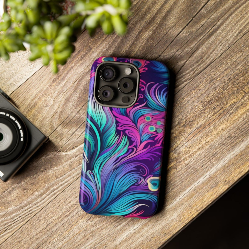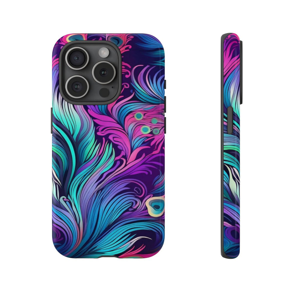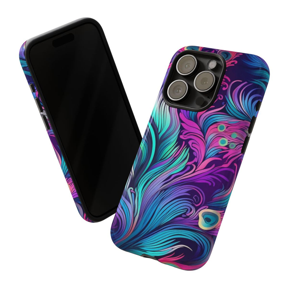 Dit hoesje heeft een levendig patroon van pauwenveren met vloeiende vormen en verfijnde details. De veren zijn afgebeeld in heldere tinten teal, magenta, roze en paars op een donkere achtergrond, wat zorgt voor een opvallend contrast. Het patroon is gedurfd en kleurrijk, zonder schaduwen, waardoor de effen kleuren en strakke lijnen goed zichtbaar zijn. Het hoesje heeft een glanzende afwerking en is extra stevig dankzij de dubbele laag van polycarbonaat en TPU. Zo biedt het optimale bescherming en is het geschikt voor draadloos opladen.