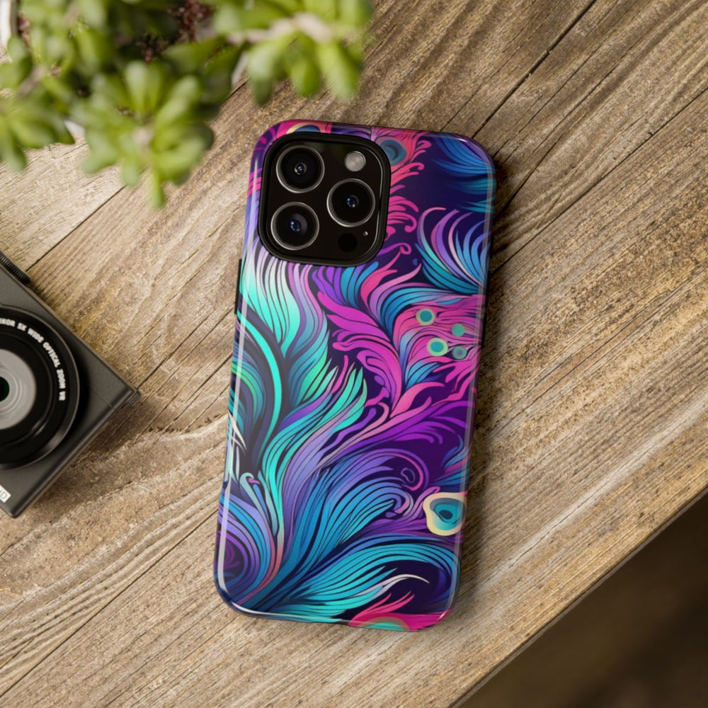 Dit hoesje heeft een levendig patroon van pauwenveren met vloeiende vormen en verfijnde details. De veren zijn afgebeeld in heldere tinten teal, magenta, roze en paars op een donkere achtergrond, wat zorgt voor een opvallend contrast. Het patroon is gedurfd en kleurrijk, zonder schaduwen, waardoor de effen kleuren en strakke lijnen goed zichtbaar zijn. Het hoesje heeft een glanzende afwerking en is extra stevig dankzij de dubbele laag van polycarbonaat en TPU. Zo biedt het optimale bescherming en is het geschikt voor draadloos opladen.