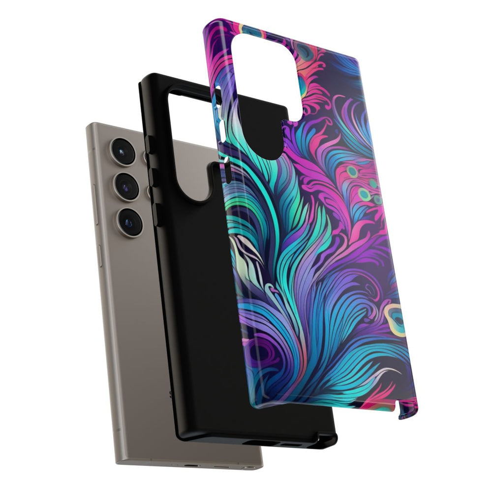 Dit hoesje heeft een levendig patroon van pauwenveren met vloeiende vormen en verfijnde details. De veren zijn afgebeeld in heldere tinten teal, magenta, roze en paars op een donkere achtergrond, wat zorgt voor een opvallend contrast. Het patroon is gedurfd en kleurrijk, zonder schaduwen, waardoor de effen kleuren en strakke lijnen goed zichtbaar zijn. Het hoesje heeft een glanzende afwerking en is extra stevig dankzij de dubbele laag van polycarbonaat en TPU. Zo biedt het optimale bescherming en is het geschikt voor draadloos opladen.