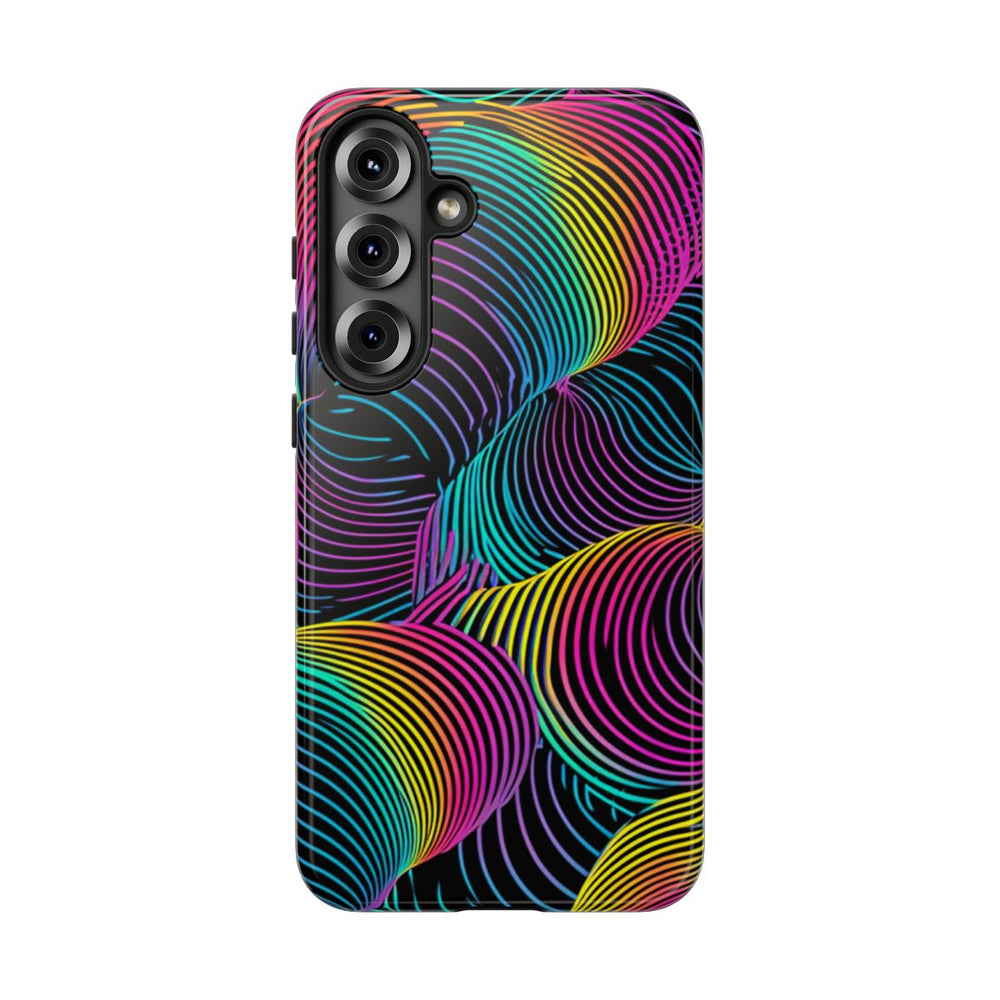 Dit telefoonhoesje heeft een opvallend psychedelisch optisch patroon met golvende, gebogen lijnen die een gevoel van diepte en beweging creëren. De lijnen lopen vloeiend over in heldere kleuren zoals roze, geel, blauw en paars op een zwarte achtergrond. Het naadloze, abstracte ontwerp zorgt voor een dynamische en energieke uitstraling. Het hoesje heeft een glanzende afwerking en bestaat uit een stevige polycarbonaat buitenkant met een TPU-binnenzijde, voor dubbele bescherming. Ondersteunt draadloos opladen.