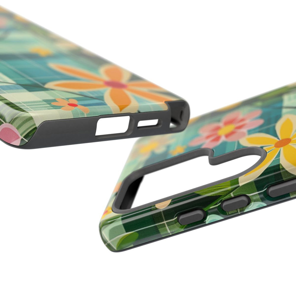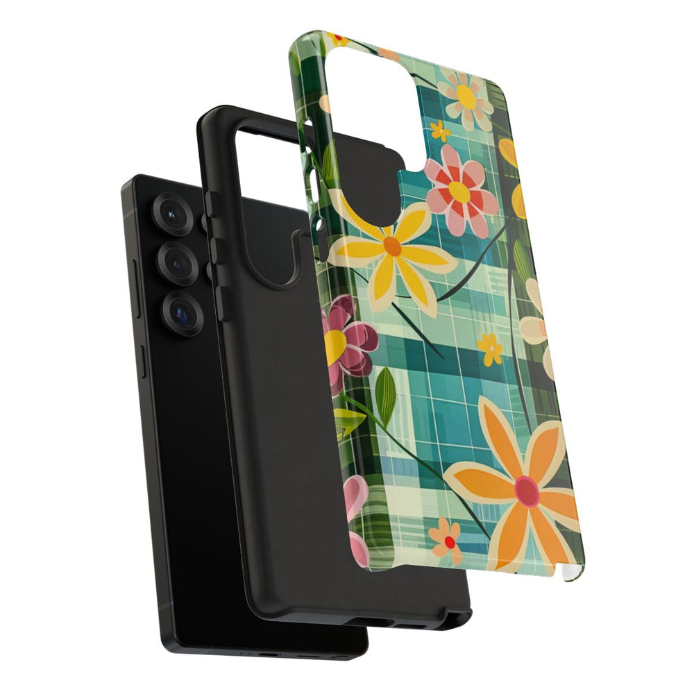 Dit hoesje heeft een opvallend retro bloemenpatroon met verschillende gestileerde bloemen in tinten geel, roze, oranje, paars en blauw. De bloemen hebben eenvoudige bloembladvormen en zijn verbonden door dunne, donkergroene stelen met bladeren. De achtergrond bestaat uit een geometrisch, ruitachtig patroon in meerdere tinten blauw en groen, wat zorgt voor een levendig en speels contrast. De afbeelding is gedrukt op een glanzend, stevig hoesje van duurzaam polycarbonaat met een TPU-binnenkant. Het hoesje biedt goede bescherming en ondersteunt draadloos opladen.