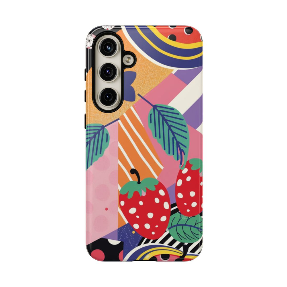Dit hoesje heeft een opvallend retro popart ontwerp met felle, kleurrijke accenten. Twee grote rode aardbeien met witte stippen en groene blaadjes staan centraal in het patroon. Daaromheen zijn verschillende geometrische vormen te zien, zoals sterren in geel, oranje en roze, strepen en stippen in zwart, wit, roze en paars. De achtergrond is een levendige mix van kleuren en patronen, wat zorgt voor een speelse en energieke uitstraling. Het hoesje is glanzend, stevig en gemaakt van duurzame materialen. Ondersteunt draadloos opladen.