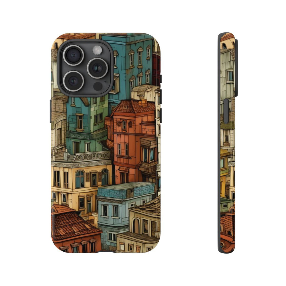 Dit hoesje is voorzien van een dicht, naadloos patroon van stedelijke gebouwen in verschillende bouwstijlen. De gebouwen zijn gedetailleerd getekend met ramen, daken en gevels in een palet van gedempte kleuren zoals blauw, bruin, crème en rood. Het patroon zorgt voor een visueel rijke en verfijnde stadsaanblik met een handgetekende, artistieke uitstraling. Het hoesje heeft een glanzende afwerking en is gemaakt van polycarbonaat en TPU, waardoor het stevig is en bestand tegen gebruik buitenshuis. Ondersteunt draadloos opladen.
