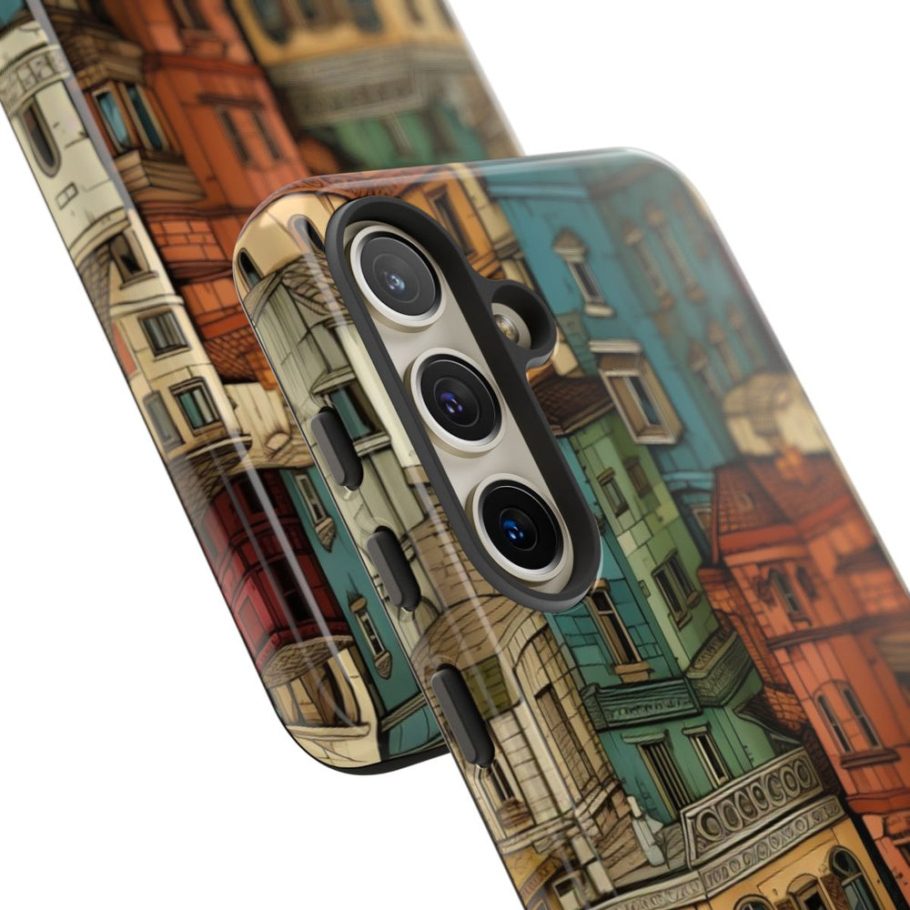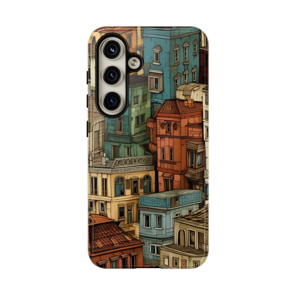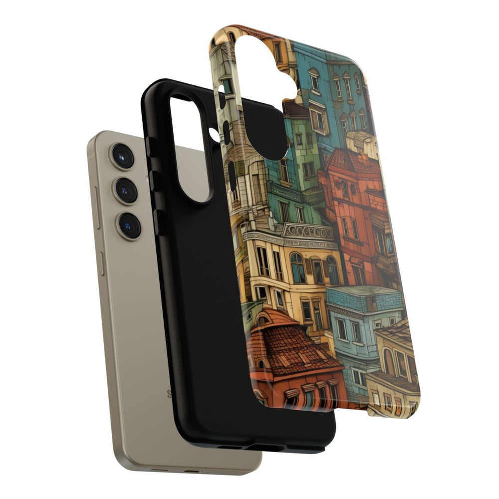 Dit hoesje is voorzien van een dicht, naadloos patroon van stedelijke gebouwen in verschillende bouwstijlen. De gebouwen zijn gedetailleerd getekend met ramen, daken en gevels in een palet van gedempte kleuren zoals blauw, bruin, crème en rood. Het patroon zorgt voor een visueel rijke en verfijnde stadsaanblik met een handgetekende, artistieke uitstraling. Het hoesje heeft een glanzende afwerking en is gemaakt van polycarbonaat en TPU, waardoor het stevig is en bestand tegen gebruik buitenshuis. Ondersteunt draadloos opladen.