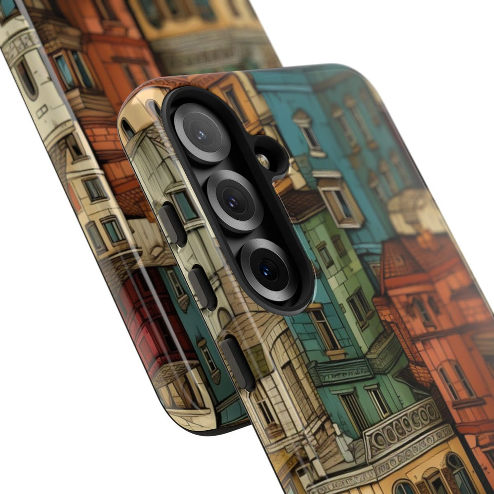 Dit hoesje is voorzien van een dicht, naadloos patroon van stedelijke gebouwen in verschillende bouwstijlen. De gebouwen zijn gedetailleerd getekend met ramen, daken en gevels in een palet van gedempte kleuren zoals blauw, bruin, crème en rood. Het patroon zorgt voor een visueel rijke en verfijnde stadsaanblik met een handgetekende, artistieke uitstraling. Het hoesje heeft een glanzende afwerking en is gemaakt van polycarbonaat en TPU, waardoor het stevig is en bestand tegen gebruik buitenshuis. Ondersteunt draadloos opladen.