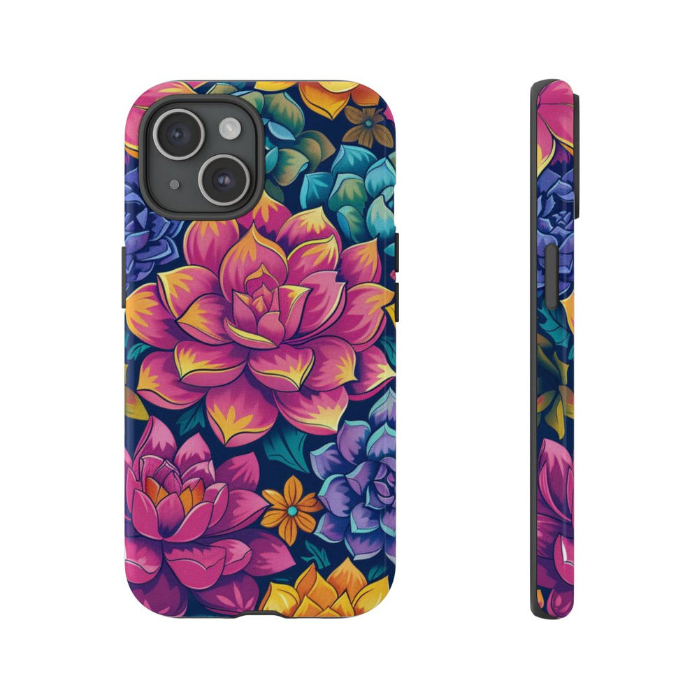 Dit telefoonhoesje is bedrukt met een levendig patroon van vetplanten en bloemen in opvallende kleuren zoals roze, geel, paars, turquoise en groen. De bloemen zijn gestileerd met gedetailleerde schaduwen en accenten, wat zorgt voor een uitstraling die doet denken aan tatoeages. De donkere achtergrond laat de felle kleuren extra opvallen. Het hoesje heeft een glanzende afwerking en bestaat uit polycarbonaat en TPU voor stevige bescherming. Dankzij de dubbele laag is het hoesje duurzaam en bestand tegen gebruik buitenshuis. Draadloos opladen blijft mogelijk met dit hoesje.
