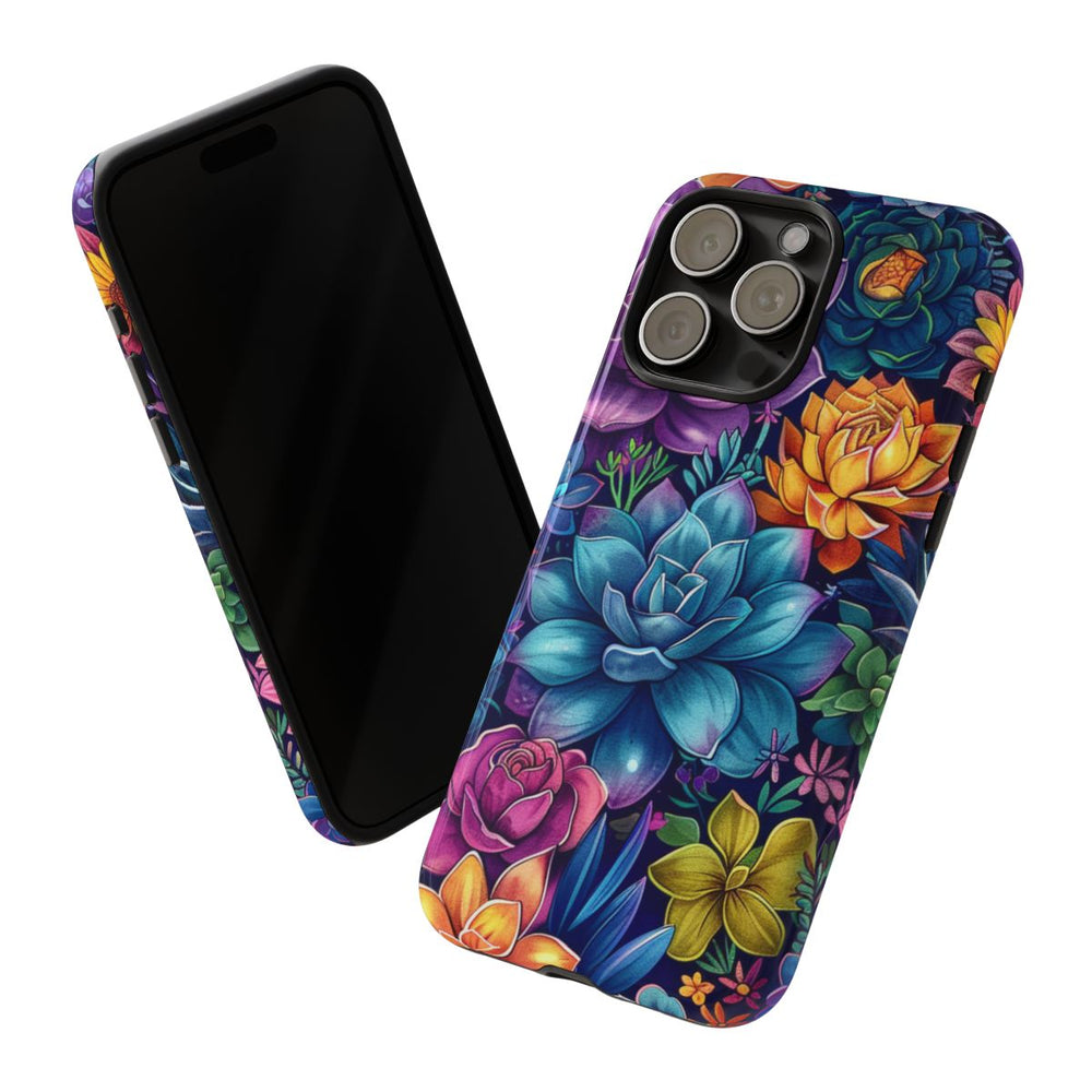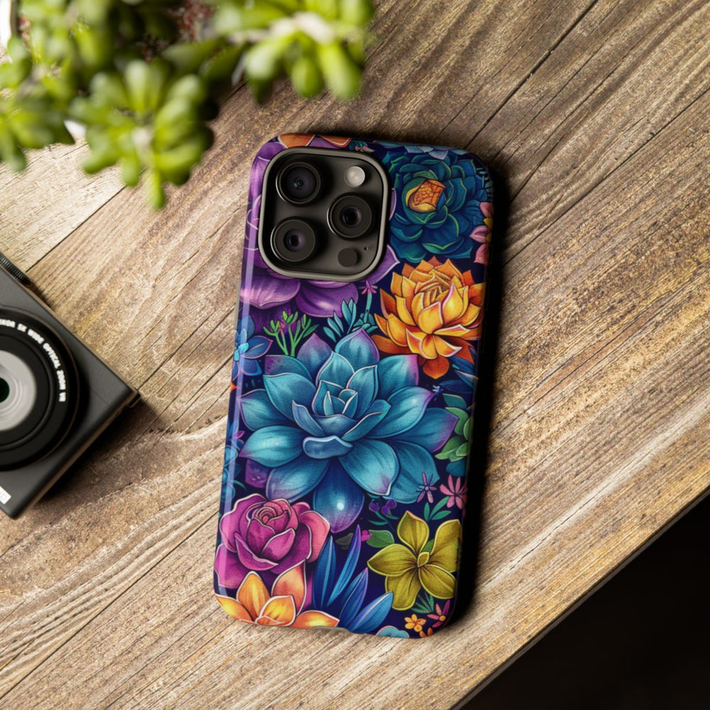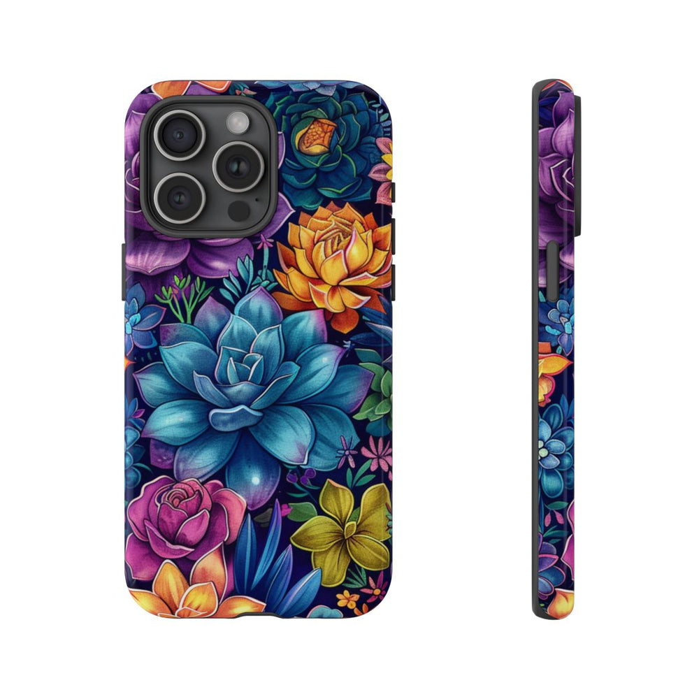 Dit hoesje is bedrukt met een levendig en gedetailleerd patroon van verschillende vetplanten en bloemen in rijke kleuren zoals paars, blauw, geel, roze en groen. Het ontwerp heeft een tatoeagestijl met fijne schaduwen en accenten, waardoor een dynamisch en speels bloemenmotief ontstaat. De donkere achtergrond laat de kleuren van de planten extra opvallen. Het patroon is aangebracht op een glanzend en stevig hoesje van polycarbonaat en TPU, dat bestaat uit twee lagen voor optimale bescherming en geschikt is voor draadloos opladen.