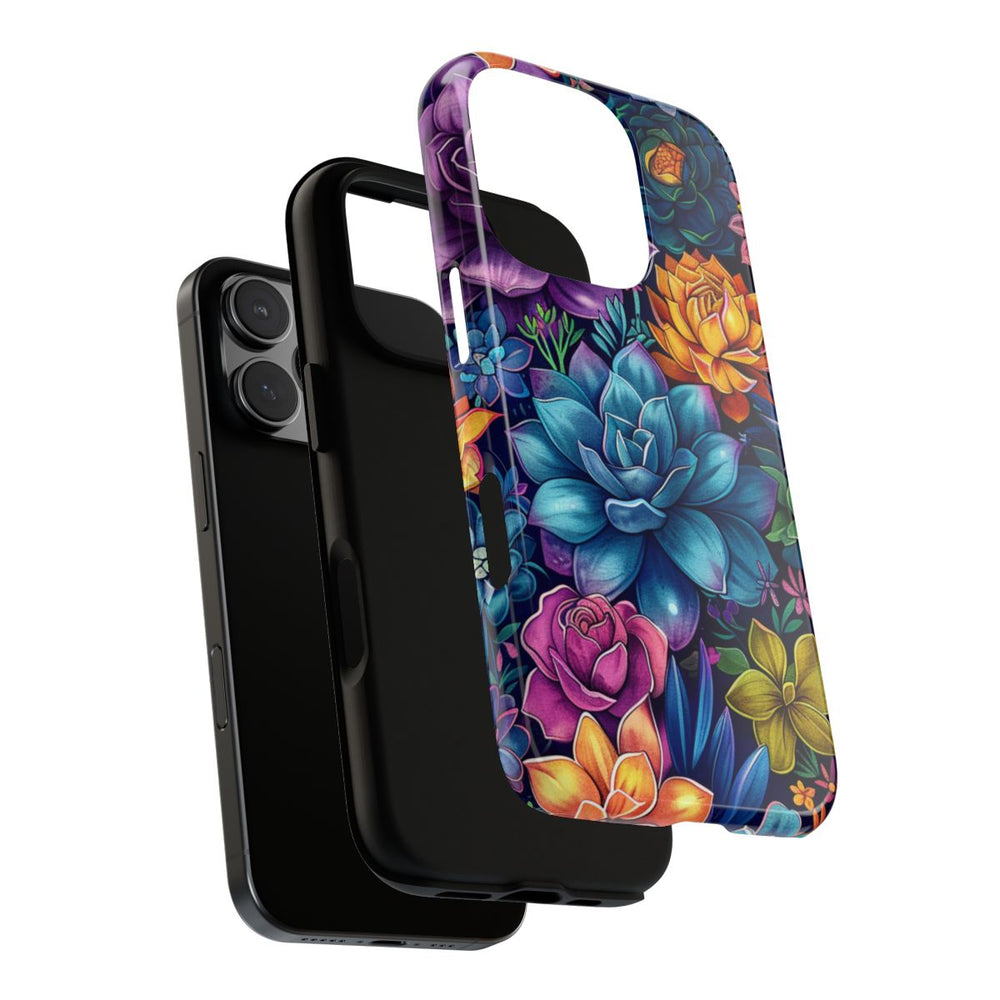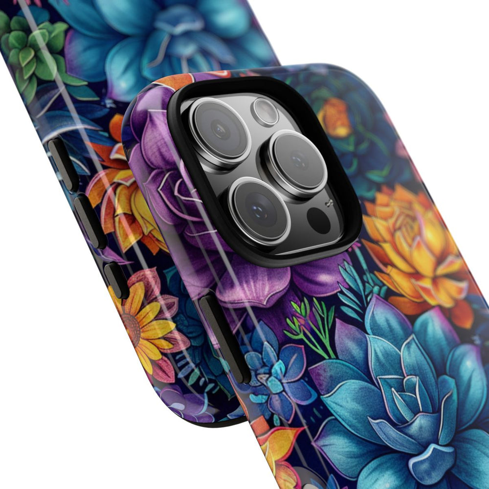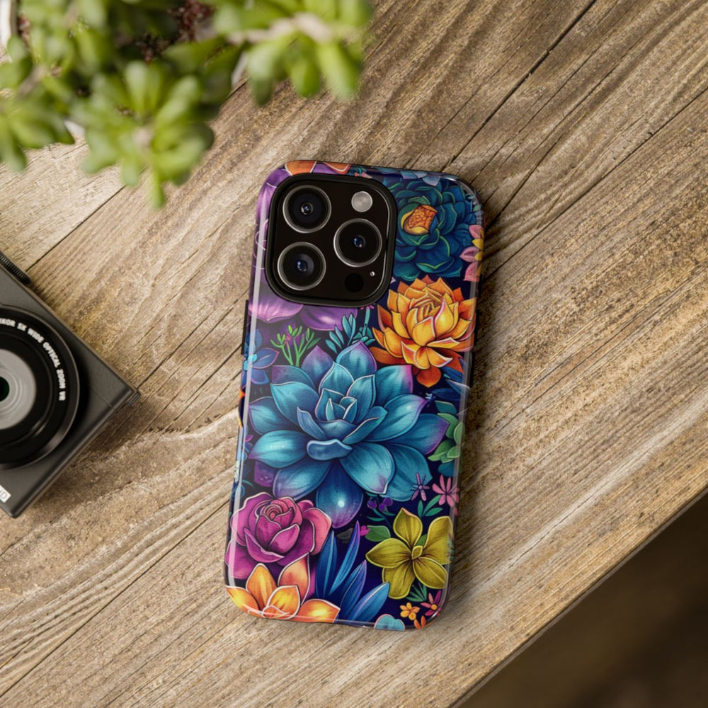Dit hoesje is bedrukt met een levendig en gedetailleerd patroon van verschillende vetplanten en bloemen in rijke kleuren zoals paars, blauw, geel, roze en groen. Het ontwerp heeft een tatoeagestijl met fijne schaduwen en accenten, waardoor een dynamisch en speels bloemenmotief ontstaat. De donkere achtergrond laat de kleuren van de planten extra opvallen. Het patroon is aangebracht op een glanzend en stevig hoesje van polycarbonaat en TPU, dat bestaat uit twee lagen voor optimale bescherming en geschikt is voor draadloos opladen.