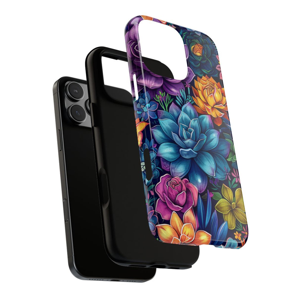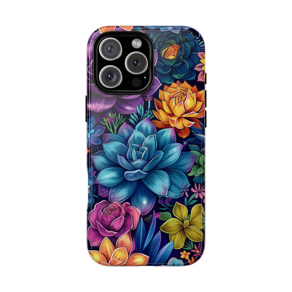 Dit hoesje is bedrukt met een levendig en gedetailleerd patroon van verschillende vetplanten en bloemen in rijke kleuren zoals paars, blauw, geel, roze en groen. Het ontwerp heeft een tatoeagestijl met fijne schaduwen en accenten, waardoor een dynamisch en speels bloemenmotief ontstaat. De donkere achtergrond laat de kleuren van de planten extra opvallen. Het patroon is aangebracht op een glanzend en stevig hoesje van polycarbonaat en TPU, dat bestaat uit twee lagen voor optimale bescherming en geschikt is voor draadloos opladen.