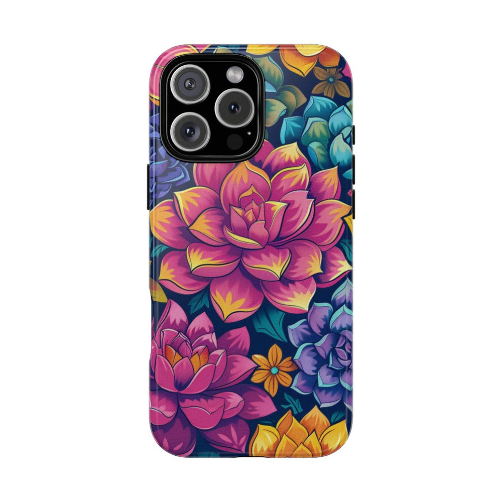 Dit telefoonhoesje is bedrukt met een levendig patroon van vetplanten en bloemen in opvallende kleuren zoals roze, geel, paars, turquoise en groen. De bloemen zijn gestileerd met gedetailleerde schaduwen en accenten, wat zorgt voor een uitstraling die doet denken aan tatoeages. De donkere achtergrond laat de felle kleuren extra opvallen. Het hoesje heeft een glanzende afwerking en bestaat uit polycarbonaat en TPU voor stevige bescherming. Dankzij de dubbele laag is het hoesje duurzaam en bestand tegen gebruik buitenshuis. Draadloos opladen blijft mogelijk met dit hoesje.