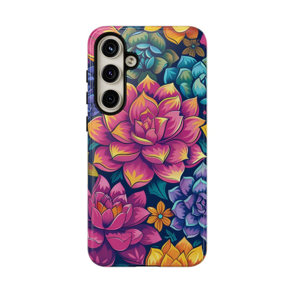 Dit telefoonhoesje is bedrukt met een levendig patroon van vetplanten en bloemen in opvallende kleuren zoals roze, geel, paars, turquoise en groen. De bloemen zijn gestileerd met gedetailleerde schaduwen en accenten, wat zorgt voor een uitstraling die doet denken aan tatoeages. De donkere achtergrond laat de felle kleuren extra opvallen. Het hoesje heeft een glanzende afwerking en bestaat uit polycarbonaat en TPU voor stevige bescherming. Dankzij de dubbele laag is het hoesje duurzaam en bestand tegen gebruik buitenshuis. Draadloos opladen blijft mogelijk met dit hoesje.