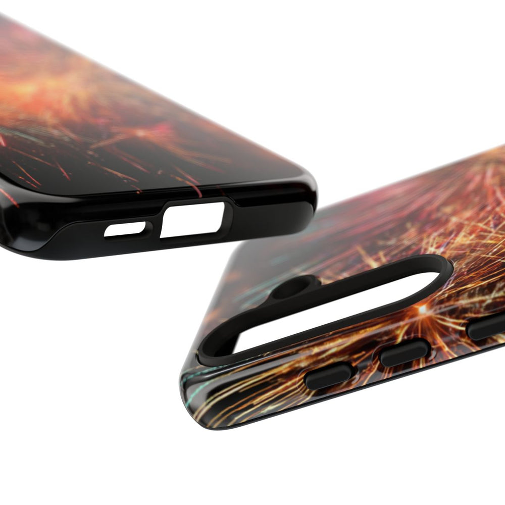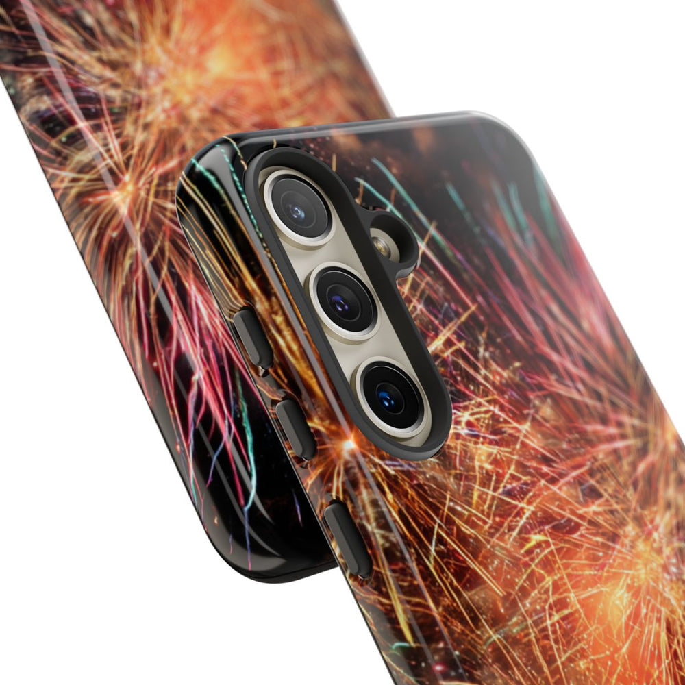 Dit hoesje heeft een levendig ontwerp met vuurwerk dat uitbarst tegen een zwarte nachtelijke hemel. De vuurpijlen tonen een mix van heldere kleuren zoals goud, rood, turquoise en paars, wat zorgt voor een dynamische en feestelijke uitstraling. De afbeelding legt de fijne sporen en vonken van het vuurwerk vast, precies op het moment van ontploffen. Het hoesje heeft een glanzende afwerking en is stevig opgebouwd uit een dubbele laag met een polycarbonaat buitenkant en een TPU binnenzijde. Dit zorgt voor extra bescherming en maakt het hoesje geschikt voor gebruik buitenshuis. Het hoesje ondersteunt draadloos opladen en behoudt langdurig zijn heldere uitstraling.