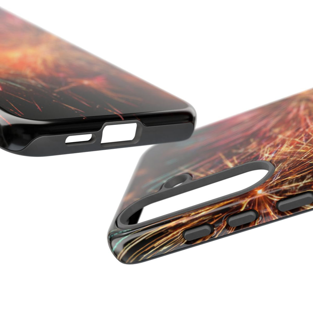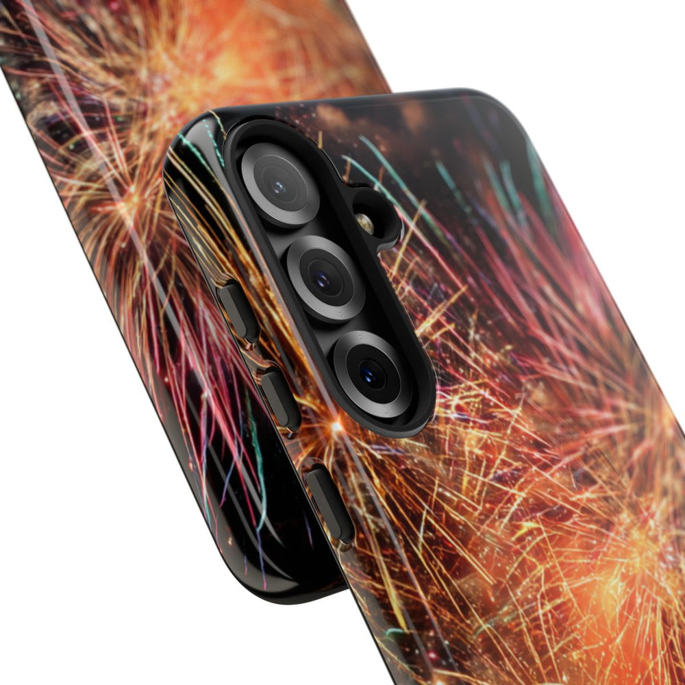 Dit hoesje heeft een levendig ontwerp met vuurwerk dat uitbarst tegen een zwarte nachtelijke hemel. De vuurpijlen tonen een mix van heldere kleuren zoals goud, rood, turquoise en paars, wat zorgt voor een dynamische en feestelijke uitstraling. De afbeelding legt de fijne sporen en vonken van het vuurwerk vast, precies op het moment van ontploffen. Het hoesje heeft een glanzende afwerking en is stevig opgebouwd uit een dubbele laag met een polycarbonaat buitenkant en een TPU binnenzijde. Dit zorgt voor extra bescherming en maakt het hoesje geschikt voor gebruik buitenshuis. Het hoesje ondersteunt draadloos opladen en behoudt langdurig zijn heldere uitstraling.