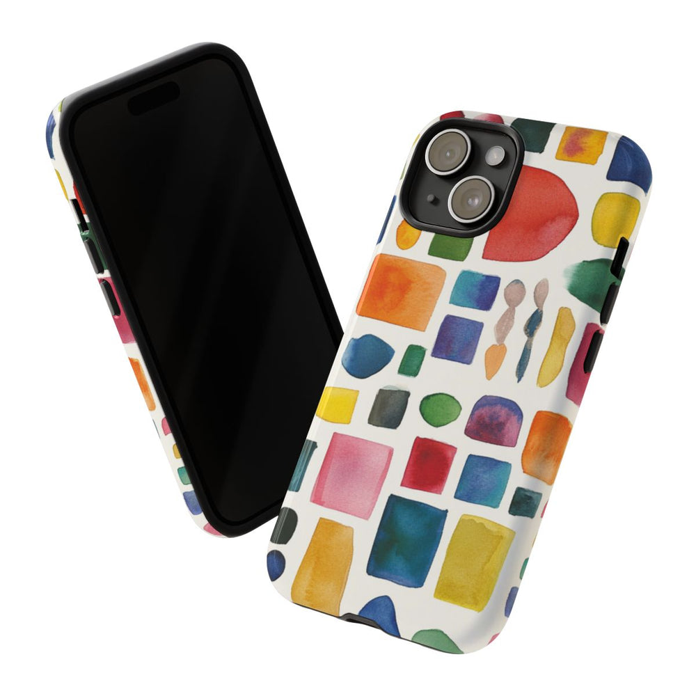 Dit telefoonhoesje heeft een levendig waterverfpatroon met verschillende geometrische vormen zoals vierkanten, rechthoeken, cirkels en ovalen. De vormen zijn geschilderd in heldere kleuren zoals blauw, rood, geel, groen, oranje en roze, willekeurig geplaatst op een witte achtergrond. Het hoesje is glanzend en extra stevig dankzij de dubbele laag met een polycarbonaat buitenkant en een TPU binnenkant. Dit zorgt voor extra duurzaamheid en bescherming. Het hoesje ondersteunt draadloos opladen en is uitstekend bestand tegen weersinvloeden.