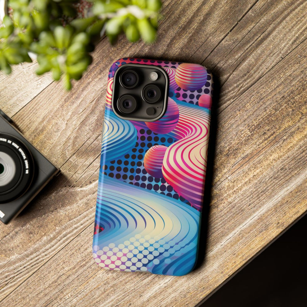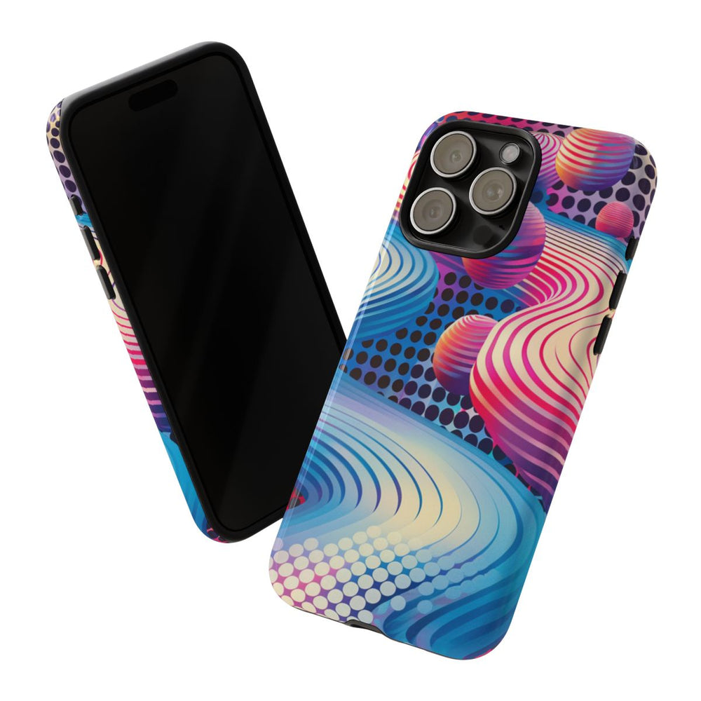 Dit hoesje heeft een opvallend ontwerp met levendige, vloeiende 3D-golven in tinten blauw, roze en crème. Gestreepte bollen in bijpassende kleuren zweven boven de golven, wat zorgt voor een dynamisch diepte-effect. De achtergrond bestaat uit een kleurverloop van warme naar koele tinten met daaroverheen een patroon van gelijkmatig verdeelde zwarte stippen, wat een retro en optisch illusie-effect geeft. Het hoesje is glanzend, stevig en bestaat uit twee lagen voor extra bescherming. Geschikt voor draadloos opladen.
