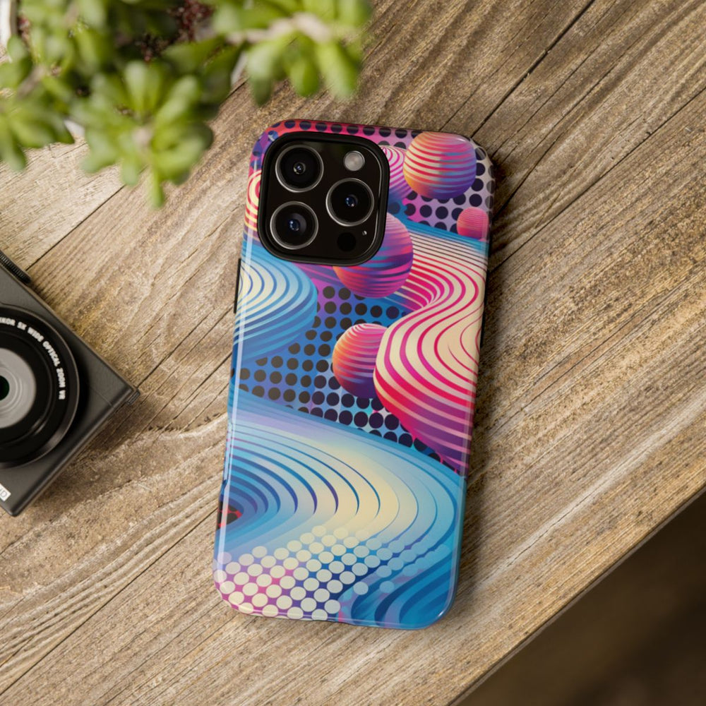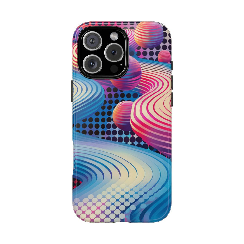 Dit hoesje heeft een opvallend ontwerp met levendige, vloeiende 3D-golven in tinten blauw, roze en crème. Gestreepte bollen in bijpassende kleuren zweven boven de golven, wat zorgt voor een dynamisch diepte-effect. De achtergrond bestaat uit een kleurverloop van warme naar koele tinten met daaroverheen een patroon van gelijkmatig verdeelde zwarte stippen, wat een retro en optisch illusie-effect geeft. Het hoesje is glanzend, stevig en bestaat uit twee lagen voor extra bescherming. Geschikt voor draadloos opladen.