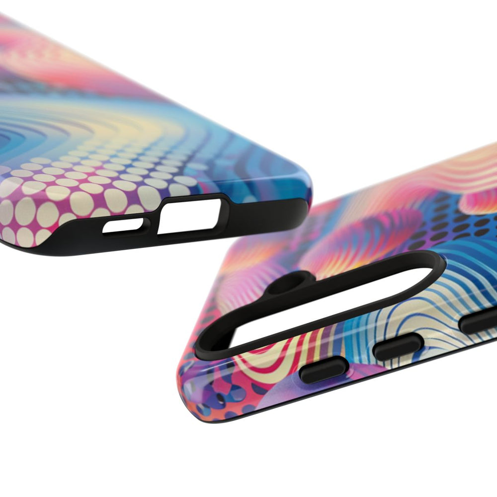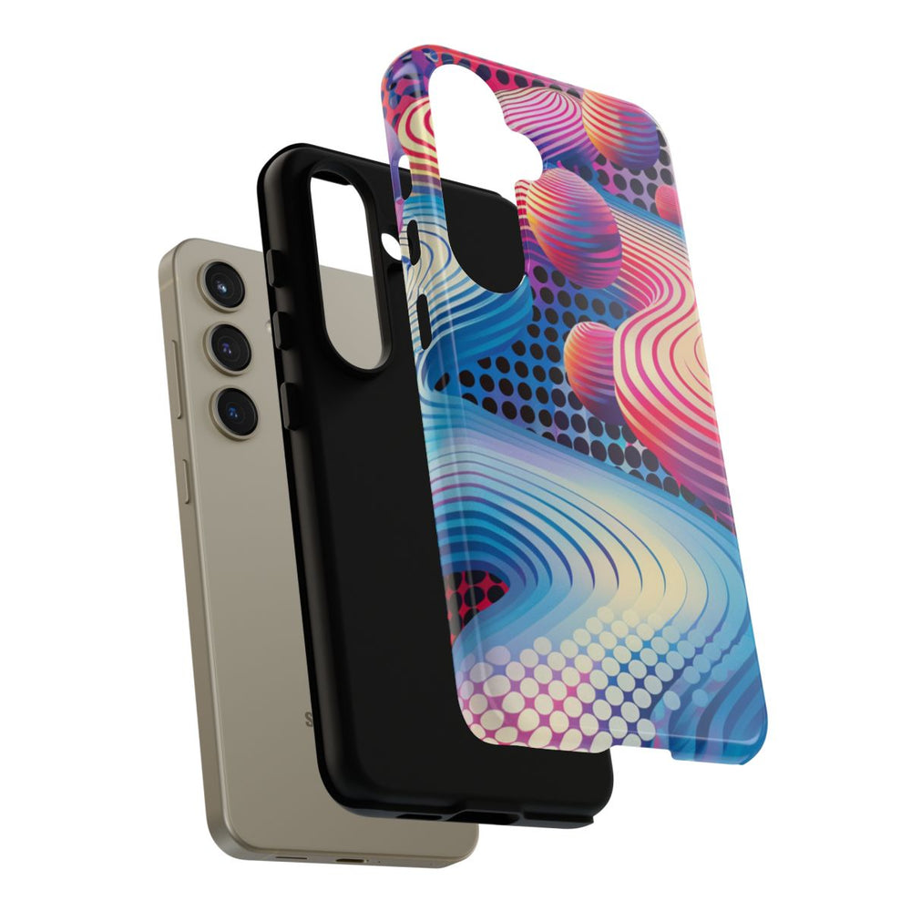 Dit hoesje heeft een opvallend ontwerp met levendige, vloeiende 3D-golven in tinten blauw, roze en crème. Gestreepte bollen in bijpassende kleuren zweven boven de golven, wat zorgt voor een dynamisch diepte-effect. De achtergrond bestaat uit een kleurverloop van warme naar koele tinten met daaroverheen een patroon van gelijkmatig verdeelde zwarte stippen, wat een retro en optisch illusie-effect geeft. Het hoesje is glanzend, stevig en bestaat uit twee lagen voor extra bescherming. Geschikt voor draadloos opladen.