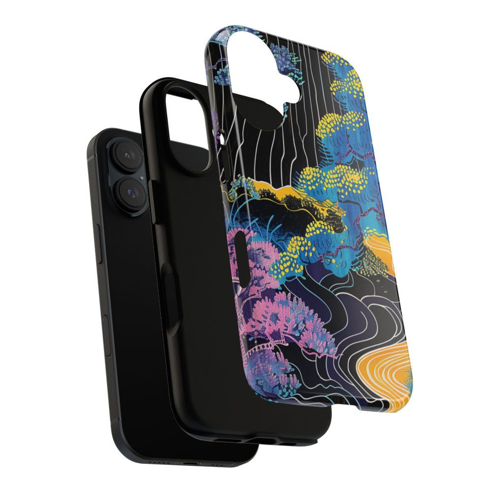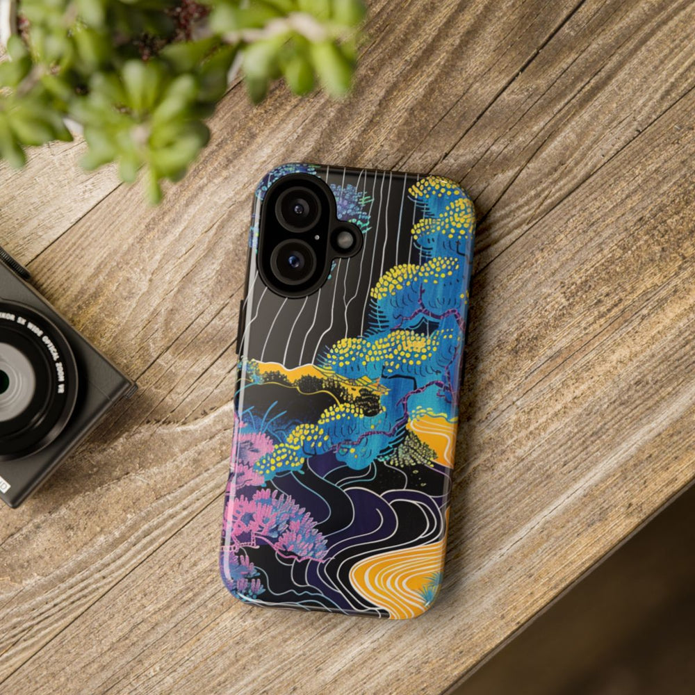 Dit ontwerp toont een abstract landschap met gestileerde bomen in levendige kleuren zoals blauw, geel, roze en paars. De bomen zijn voorzien van gedetailleerde patronen en structuren, waarbij sommige takken en bladeren als groepjes stippen zijn afgebeeld. Een felgele rivier of pad slingert door het tafereel en steekt mooi af tegen de donkere achtergrond. Witte lijnen zorgen voor extra dynamiek en diepte. De afbeelding is gedrukt op een glanzend, stevig hoesje van polycarbonaat en TPU, dat bestaat uit twee lagen voor optimale bescherming en geschikt is voor draadloos opladen.