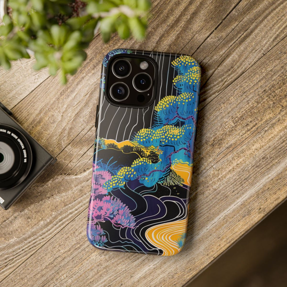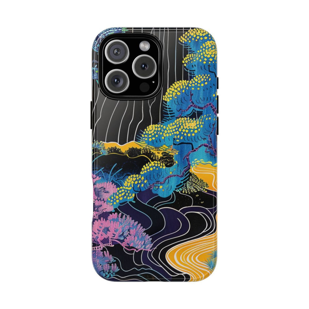 Dit ontwerp toont een abstract landschap met gestileerde bomen in levendige kleuren zoals blauw, geel, roze en paars. De bomen zijn voorzien van gedetailleerde patronen en structuren, waarbij sommige takken en bladeren als groepjes stippen zijn afgebeeld. Een felgele rivier of pad slingert door het tafereel en steekt mooi af tegen de donkere achtergrond. Witte lijnen zorgen voor extra dynamiek en diepte. De afbeelding is gedrukt op een glanzend, stevig hoesje van polycarbonaat en TPU, dat bestaat uit twee lagen voor optimale bescherming en geschikt is voor draadloos opladen.