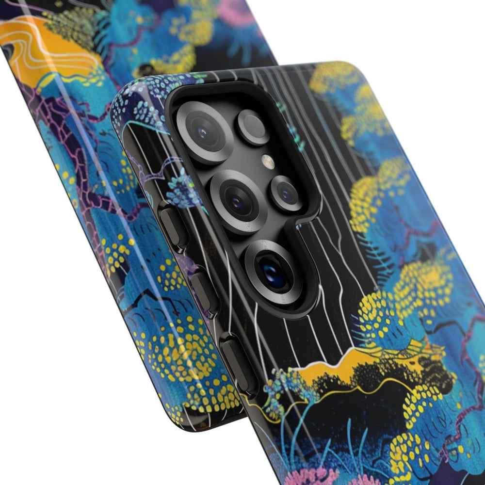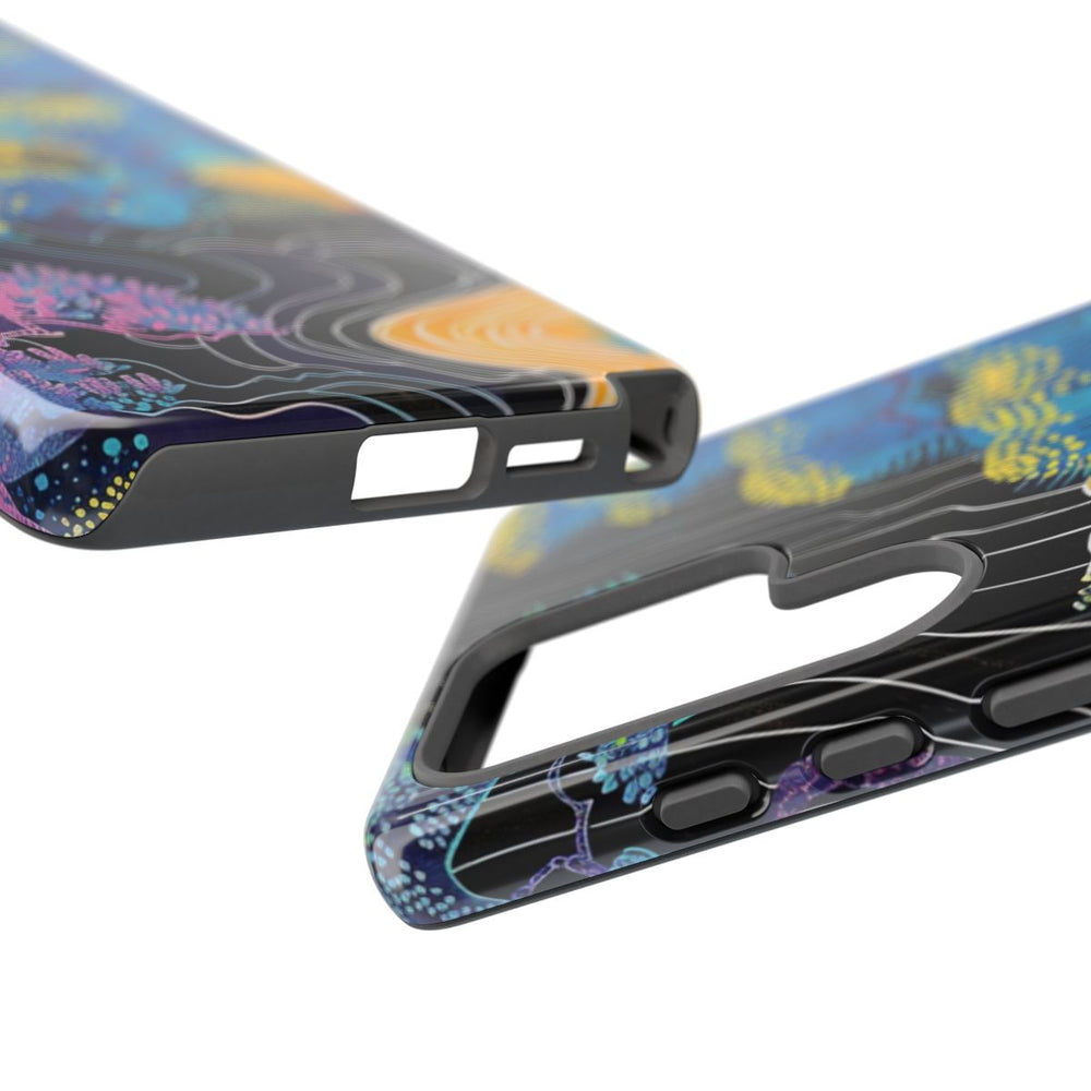 Dit ontwerp toont een abstract landschap met gestileerde bomen in levendige kleuren zoals blauw, geel, roze en paars. De bomen zijn voorzien van gedetailleerde patronen en structuren, waarbij sommige takken en bladeren als groepjes stippen zijn afgebeeld. Een felgele rivier of pad slingert door het tafereel en steekt mooi af tegen de donkere achtergrond. Witte lijnen zorgen voor extra dynamiek en diepte. De afbeelding is gedrukt op een glanzend, stevig hoesje van polycarbonaat en TPU, dat bestaat uit twee lagen voor optimale bescherming en geschikt is voor draadloos opladen.
