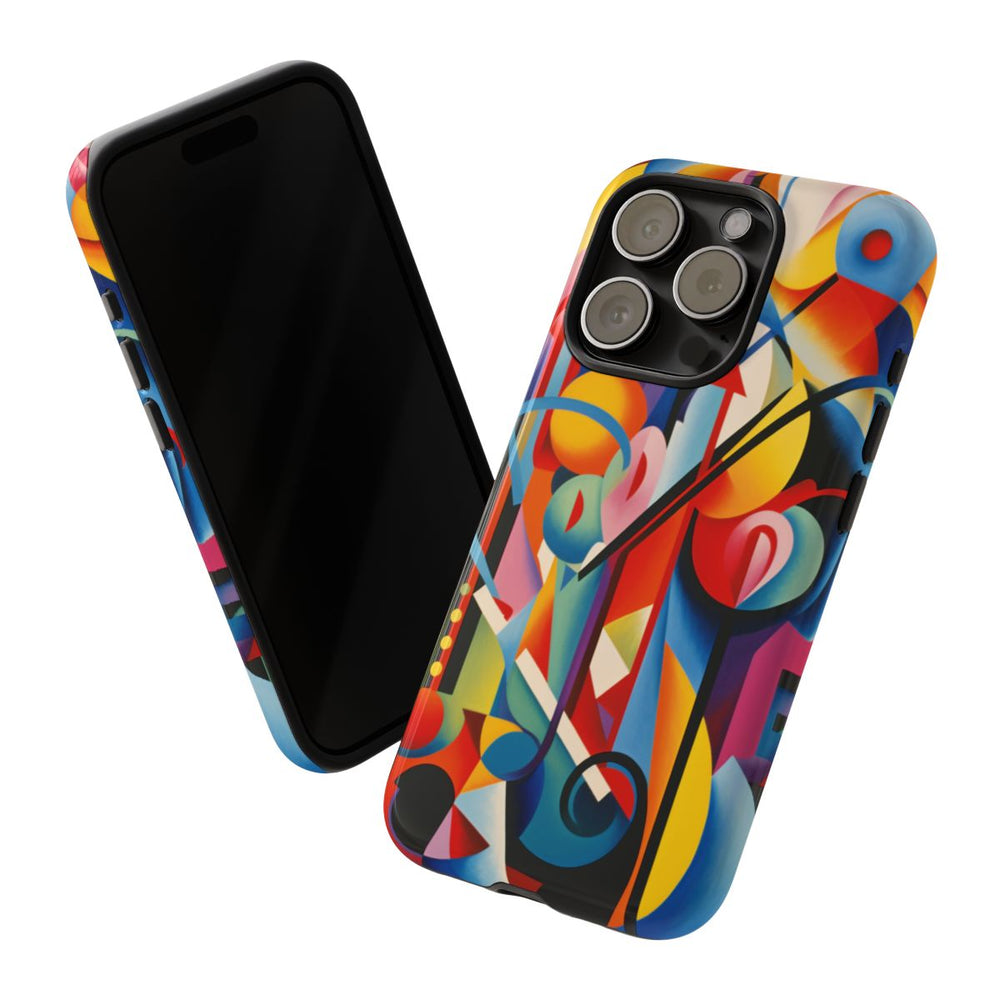 Dit ontwerp toont een abstracte, geometrische compositie met diverse vormen zoals cirkels, driehoeken en gebogen lijnen. Het kunstwerk maakt gebruik van een rijk palet aan levendige kleuren, waaronder rood, geel, blauw, roze en zwart, wat zorgt voor een dynamisch en energiek visueel effect. De vormen overlappen en kruisen elkaar, waardoor een complex en intrigerend patroon ontstaat. De afbeelding is gedrukt op een glanzend, stevig hoesje met een dubbele laag voor extra duurzaamheid en bescherming. Het hoesje ondersteunt draadloos opladen.
