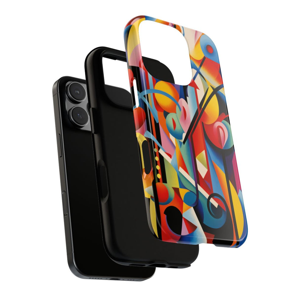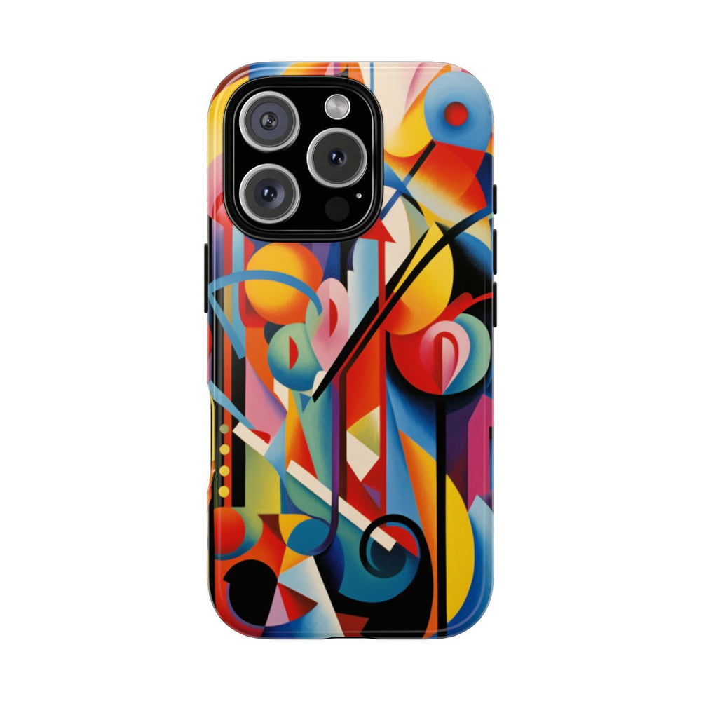 Dit ontwerp toont een abstracte, geometrische compositie met diverse vormen zoals cirkels, driehoeken en gebogen lijnen. Het kunstwerk maakt gebruik van een rijk palet aan levendige kleuren, waaronder rood, geel, blauw, roze en zwart, wat zorgt voor een dynamisch en energiek visueel effect. De vormen overlappen en kruisen elkaar, waardoor een complex en intrigerend patroon ontstaat. De afbeelding is gedrukt op een glanzend, stevig hoesje met een dubbele laag voor extra duurzaamheid en bescherming. Het hoesje ondersteunt draadloos opladen.