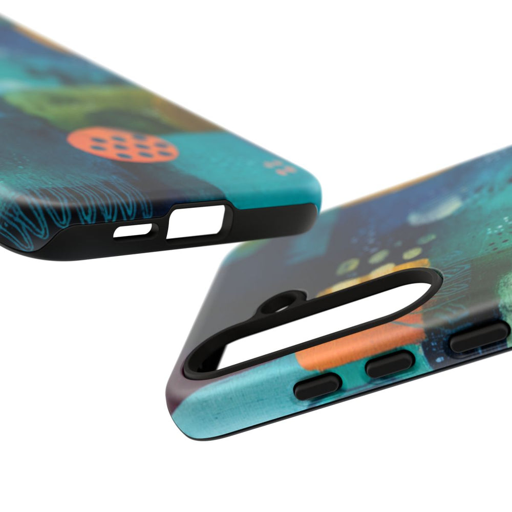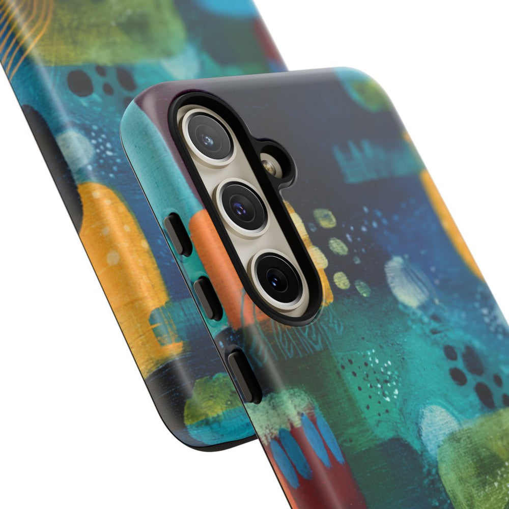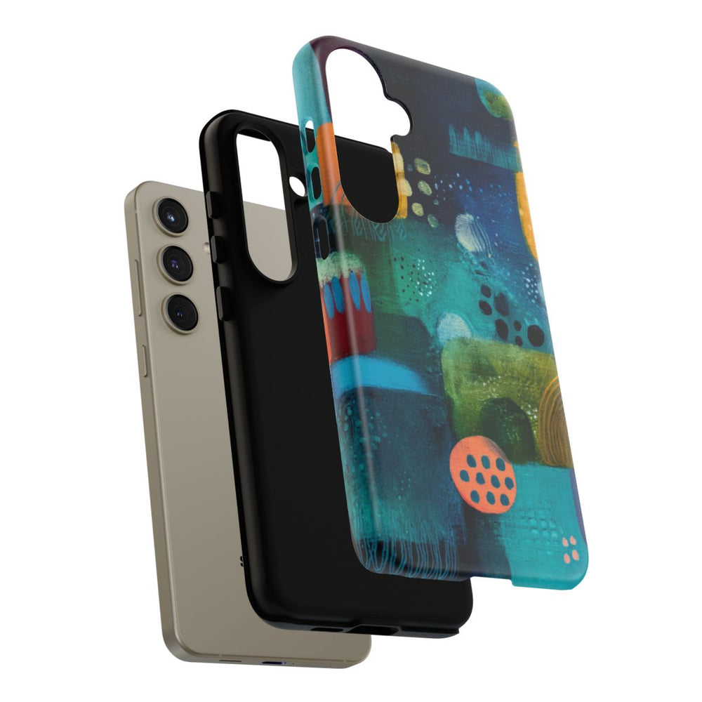 Dit telefoonhoesje heeft een abstract ontwerp met diverse geometrische vormen zoals cirkels, vierkanten en rechthoeken in levendige kleuren als turquoise, oranje, paars, groen en geel. De diepe blauwe achtergrond zorgt voor een mooi contrast met de heldere vormen. Het kunstwerk bevat patronen zoals stippen, spiralen en lijnen, wat extra structuur en diepte geeft. Het hoesje bestaat uit twee lagen: een stevige polycarbonaat buitenkant en een TPU binnenzijde. Geschikt voor draadloos opladen.