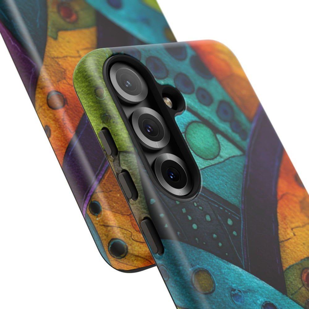 Dit hoesje heeft een opvallend abstract ontwerp met krachtige geometrische vormen zoals cirkels, bogen en rechthoeken. De compositie bestaat uit een rijk kleurenpalet met onder andere turquoise, groen, oranje, paars, rood en geel, aangevuld met gelaagde textuureffecten. Het telefoonhoesje is mat afgewerkt en bestaat uit twee lagen: een stevige polycarbonaat buitenkant en een TPU-binnenzijde. Dit zorgt voor extra bescherming en maakt het hoesje geschikt voor draadloos opladen.