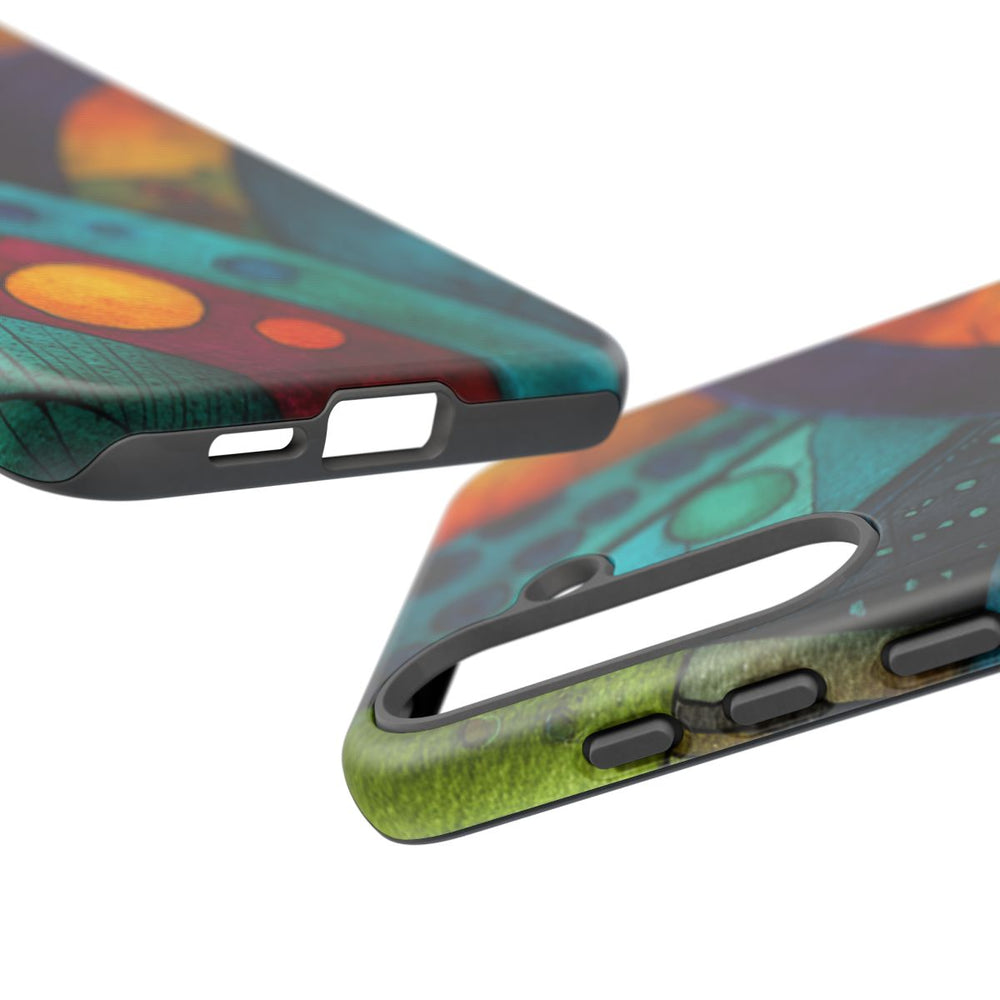 Dit telefoonhoesje heeft een levendig abstract ontwerp met opvallende geometrische vormen zoals cirkels, bogen en rechthoeken. De kleuren zijn rijk en gevarieerd, met tinten turquoise, groen, oranje, paars, geel, rood en zwart. Het beeld heeft een gelaagde, textuurachtige uitstraling die zorgt voor diepte en dynamiek. Het hoesje bestaat uit twee lagen van polycarbonaat en TPU voor extra stevigheid en is geschikt voor draadloos opladen.
