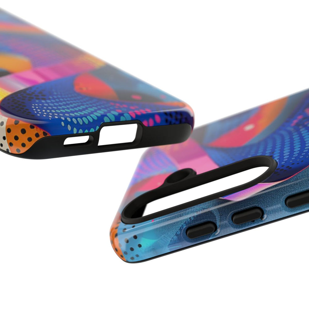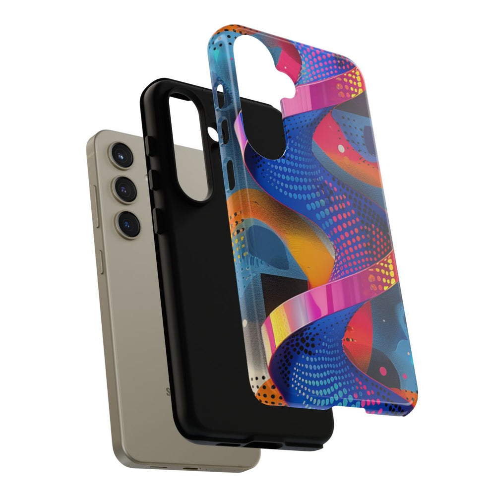 Dit telefoonhoesje heeft een opvallend abstract ontwerp met een spiraalvormig lint in blauwe, roze en paarse tinten. De achtergrond bestaat uit diverse geometrische vormen en patronen, zoals stippen en getextureerde vlakken in oranje, geel, blauw en beige. Het geheel oogt dynamisch en modern door het gebruik van vloeiende kleurverlopen en scherpe contrasten. Het hoesje is glanzend afgewerkt, heeft een stevige dubbele laag voor extra bescherming, ondersteunt draadloos opladen en is bestand tegen verschillende weersomstandigheden.