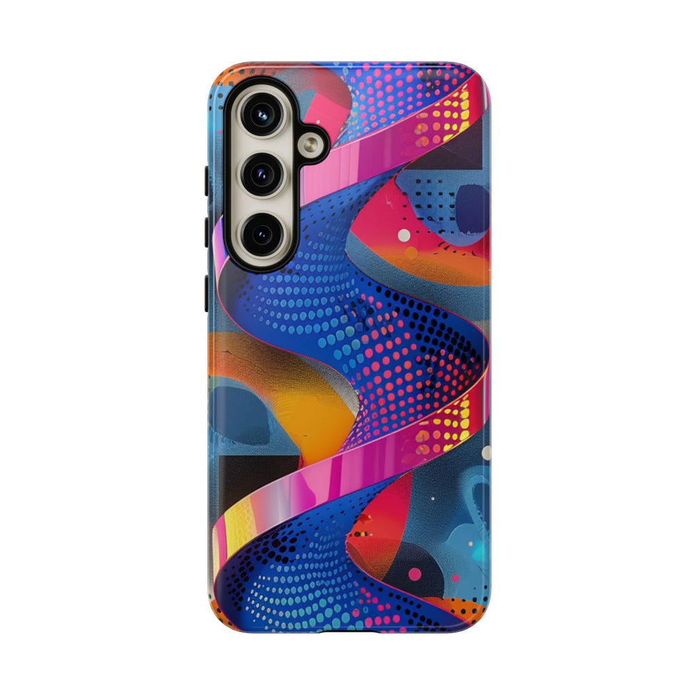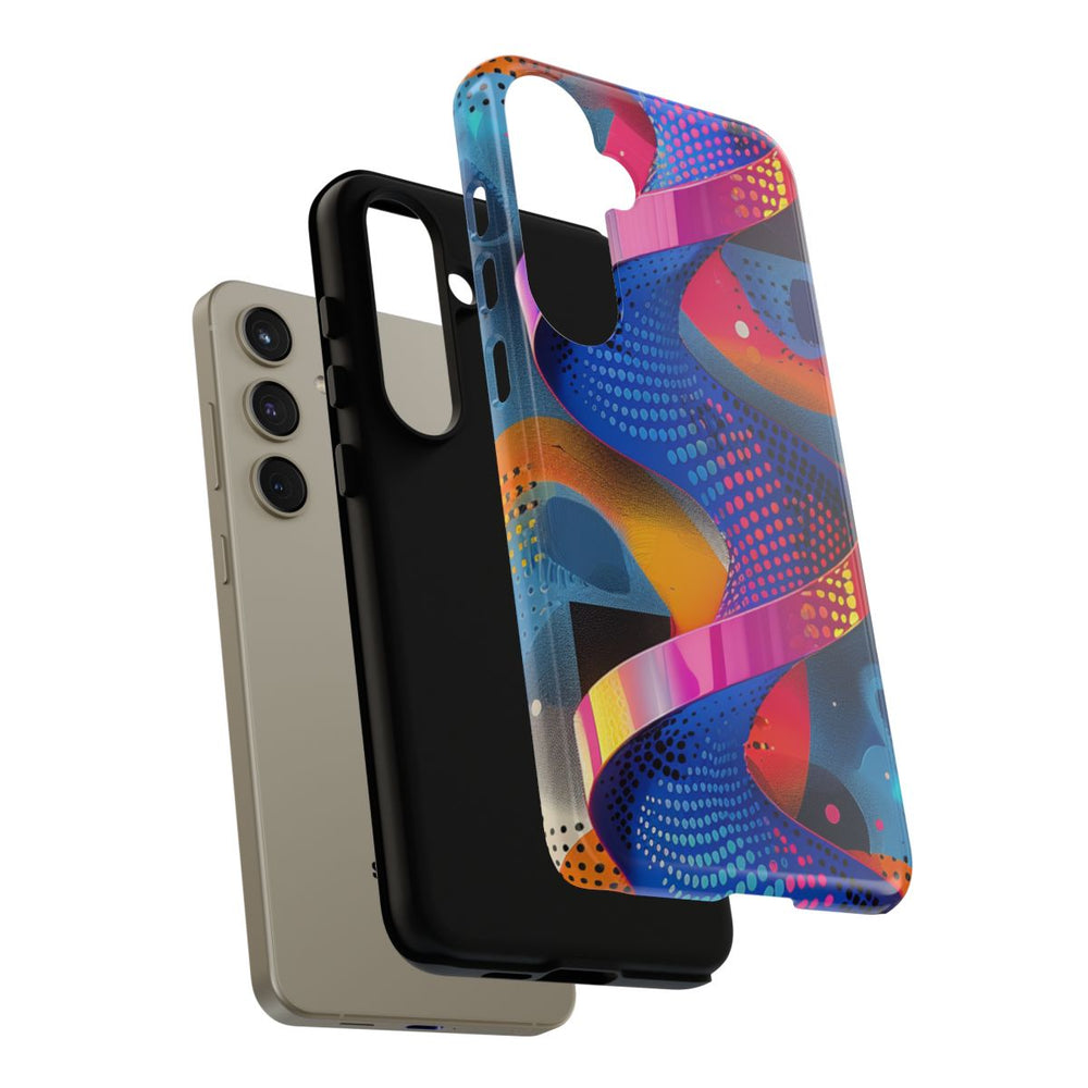 Dit telefoonhoesje heeft een opvallend abstract ontwerp met een spiraalvormig lint in blauwe, roze en paarse tinten. De achtergrond bestaat uit diverse geometrische vormen en patronen, zoals stippen en getextureerde vlakken in oranje, geel, blauw en beige. Het geheel oogt dynamisch en modern door het gebruik van vloeiende kleurverlopen en scherpe contrasten. Het hoesje is glanzend afgewerkt, heeft een stevige dubbele laag voor extra bescherming, ondersteunt draadloos opladen en is bestand tegen verschillende weersomstandigheden.