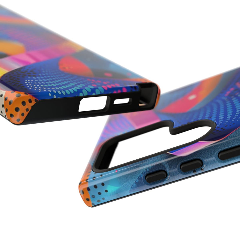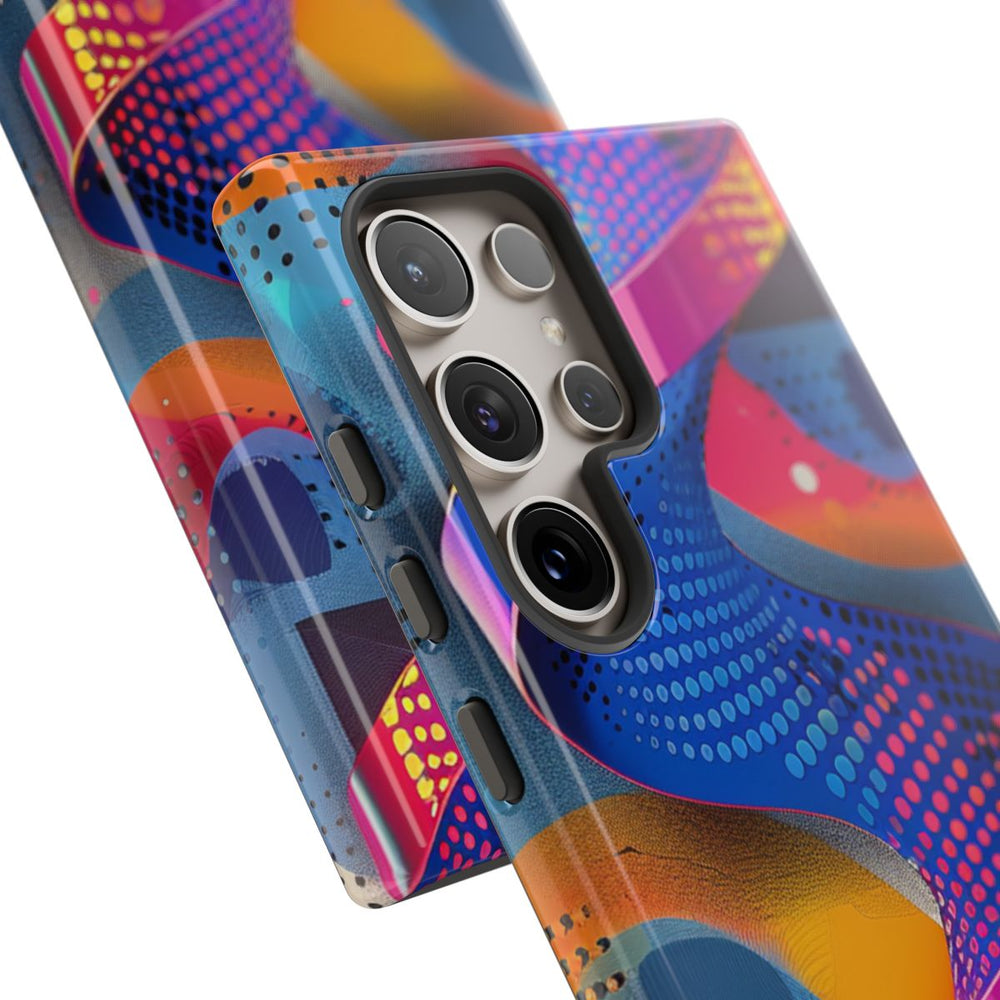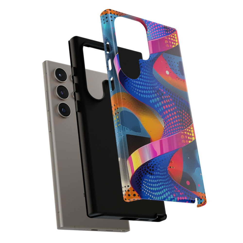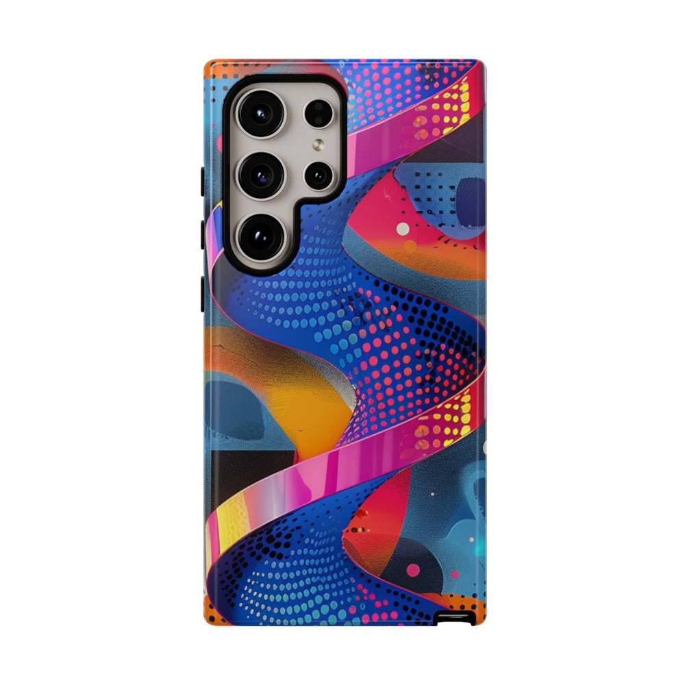 Dit telefoonhoesje heeft een opvallend abstract ontwerp met een spiraalvormig lint in blauwe, roze en paarse tinten. De achtergrond bestaat uit diverse geometrische vormen en patronen, zoals stippen en getextureerde vlakken in oranje, geel, blauw en beige. Het geheel oogt dynamisch en modern door het gebruik van vloeiende kleurverlopen en scherpe contrasten. Het hoesje is glanzend afgewerkt, heeft een stevige dubbele laag voor extra bescherming, ondersteunt draadloos opladen en is bestand tegen verschillende weersomstandigheden.