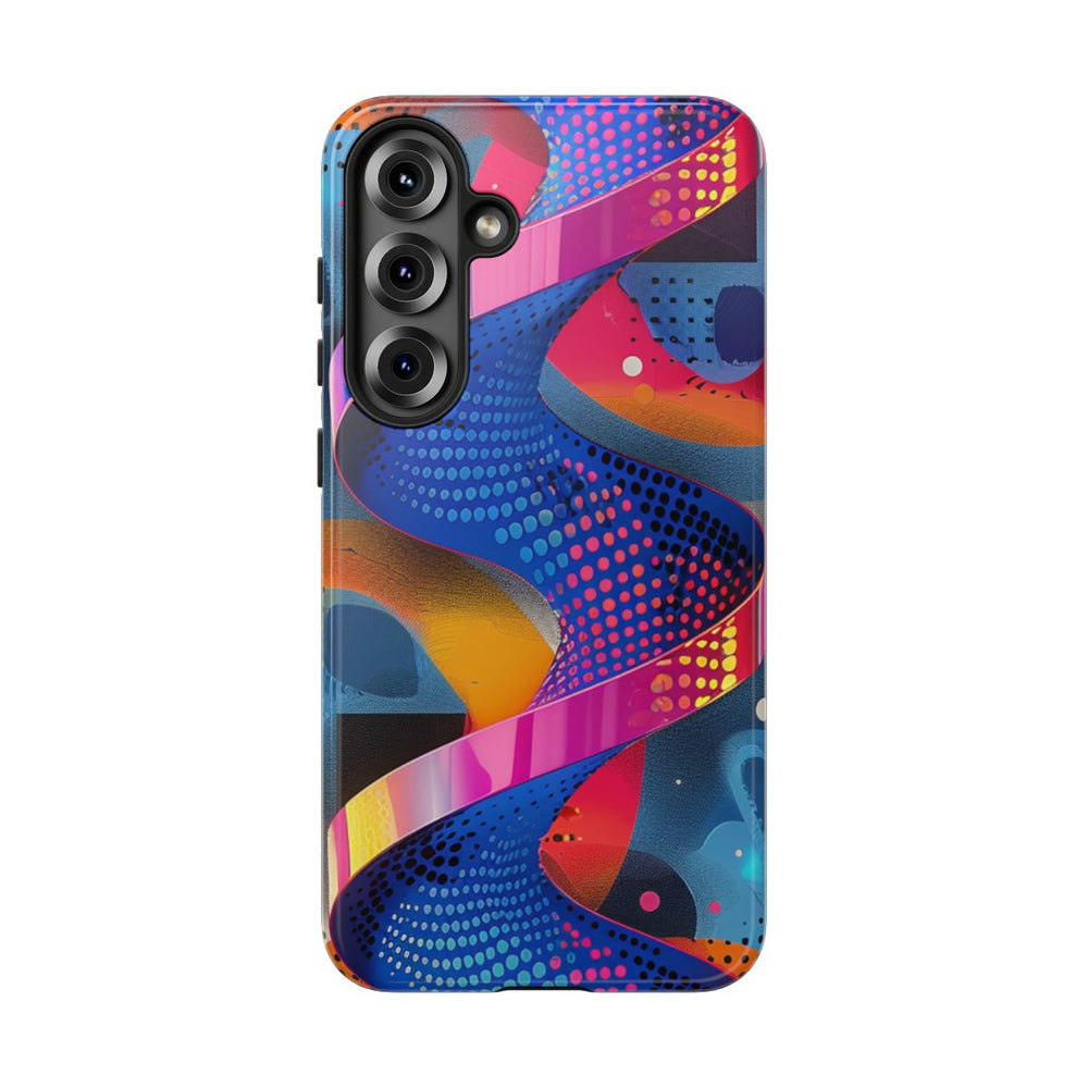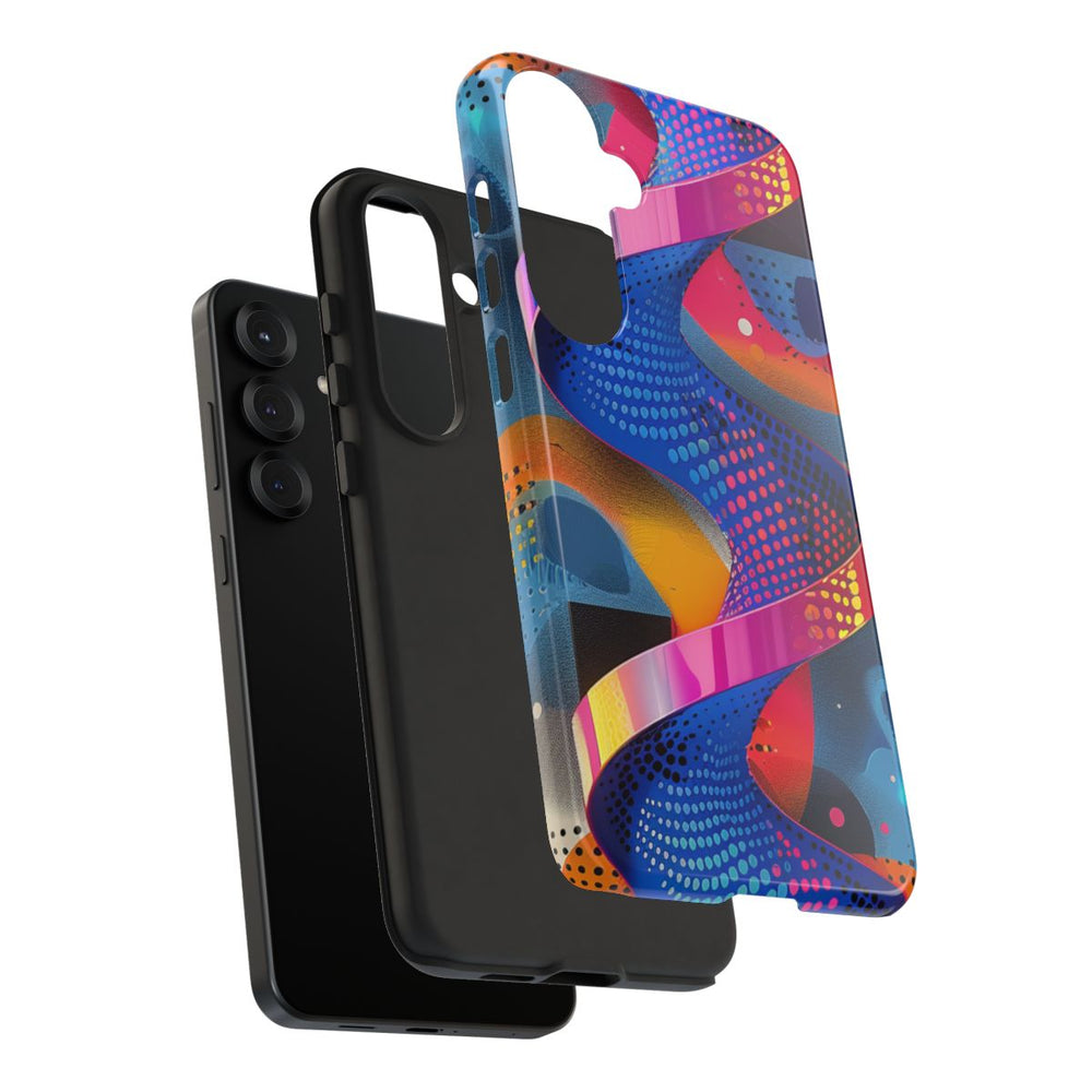 Dit telefoonhoesje heeft een opvallend abstract ontwerp met een spiraalvormig lint in blauwe, roze en paarse tinten. De achtergrond bestaat uit diverse geometrische vormen en patronen, zoals stippen en getextureerde vlakken in oranje, geel, blauw en beige. Het geheel oogt dynamisch en modern door het gebruik van vloeiende kleurverlopen en scherpe contrasten. Het hoesje is glanzend afgewerkt, heeft een stevige dubbele laag voor extra bescherming, ondersteunt draadloos opladen en is bestand tegen verschillende weersomstandigheden.