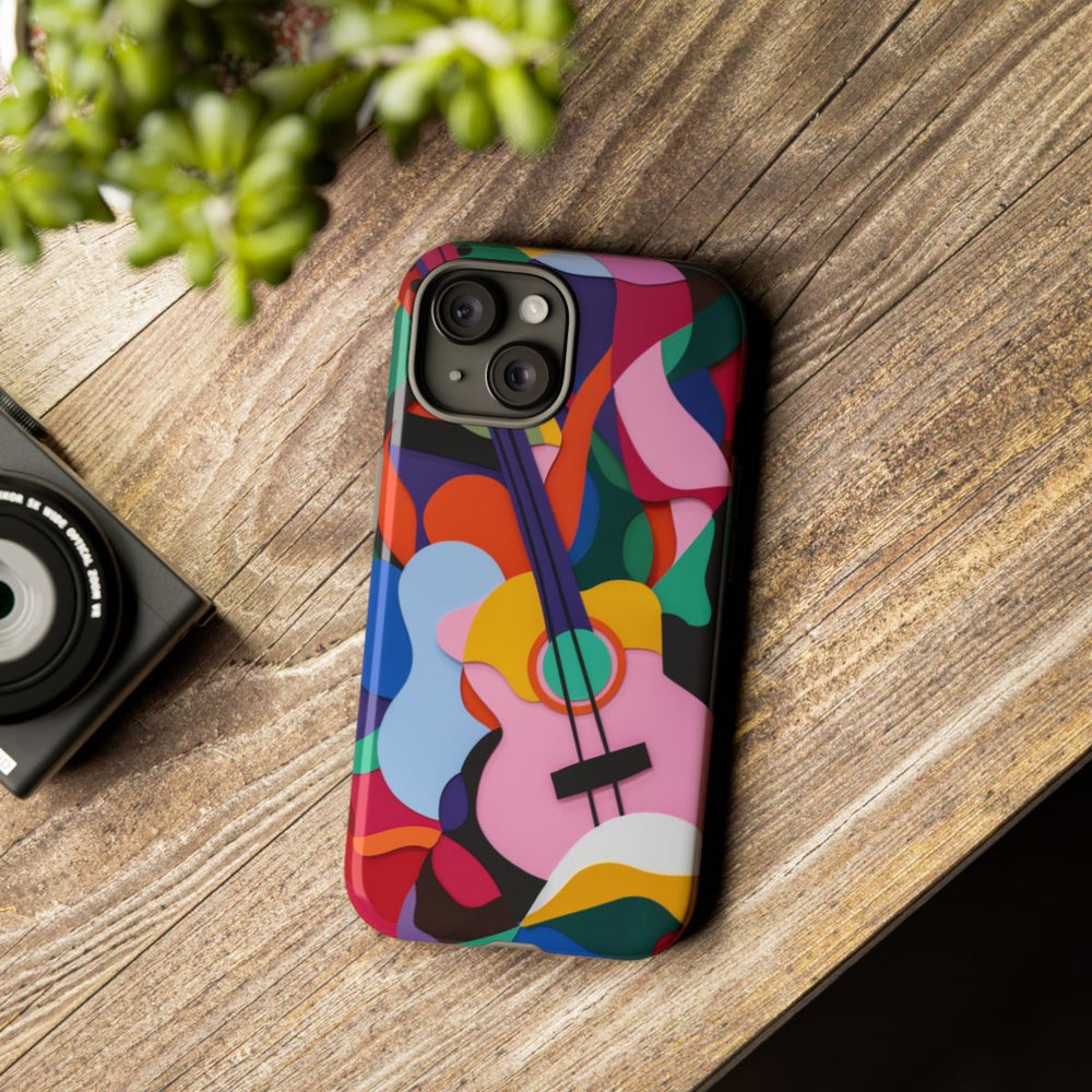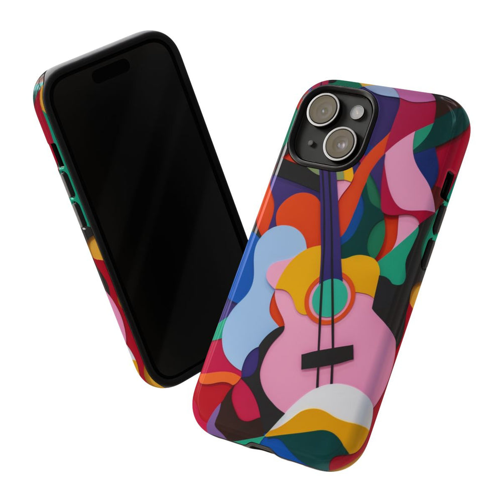 Dit hoesje is voorzien van een levendig abstract ontwerp met een gitaar als middelpunt. Felle, vlakke vormen in roze, geel, blauw, groen, rood en paars overlappen en vloeien in elkaar over, wat zorgt voor een speels en dynamisch geheel. De warme gele achtergrond laat de kleuren extra opvallen. Het hoesje bestaat uit twee lagen: een stevige polycarbonaat buitenkant en een TPU-binnenzijde. Dit zorgt voor extra bescherming en maakt het hoesje geschikt voor gebruik buitenshuis. Ondersteunt draadloos opladen.