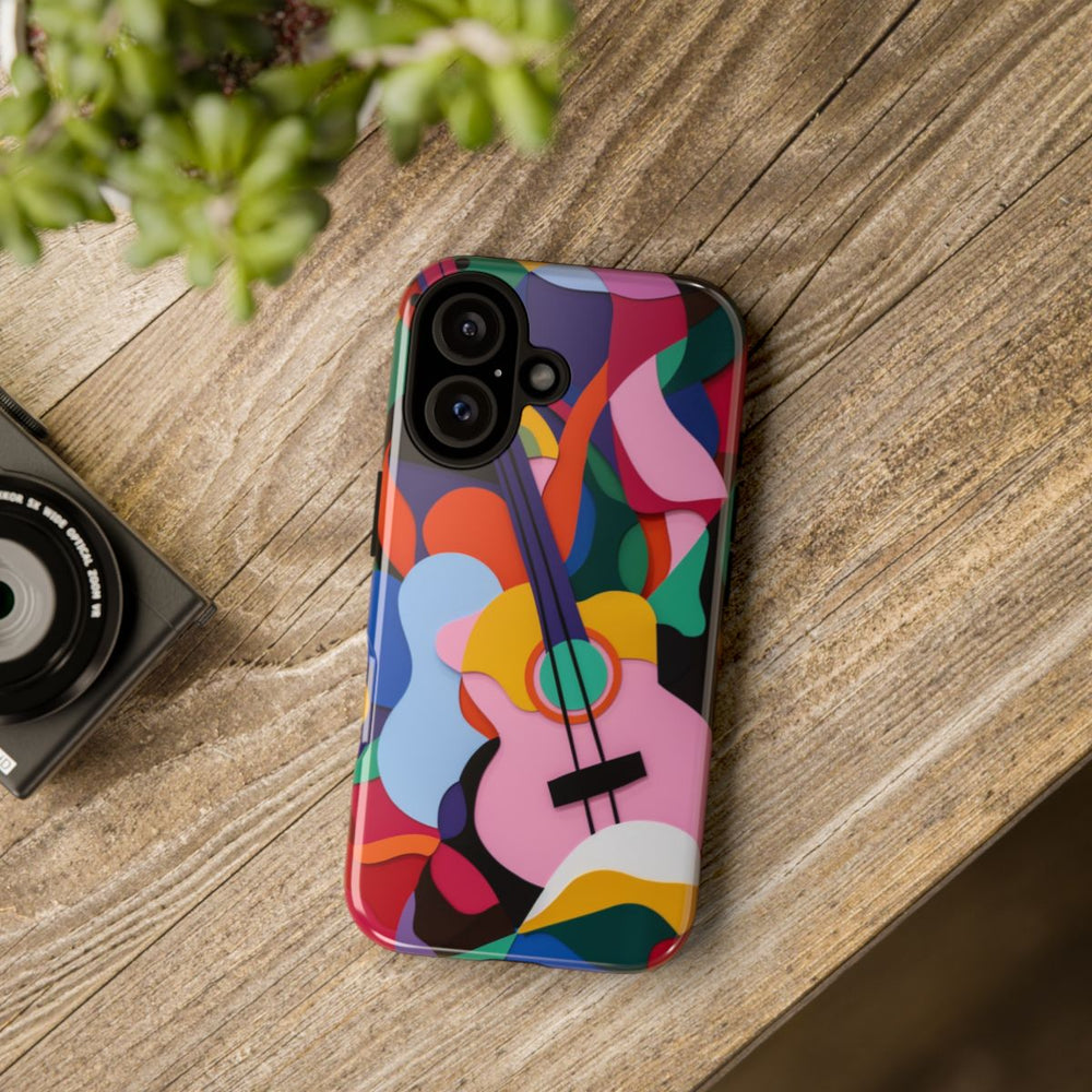 Dit hoesje is voorzien van een levendig abstract ontwerp met een gitaar als middelpunt. Felle, vlakke vormen in roze, geel, blauw, groen, rood en paars overlappen en vloeien in elkaar over, wat zorgt voor een speels en dynamisch geheel. De warme gele achtergrond laat de kleuren extra opvallen. Het hoesje bestaat uit twee lagen: een stevige polycarbonaat buitenkant en een TPU-binnenzijde. Dit zorgt voor extra bescherming en maakt het hoesje geschikt voor gebruik buitenshuis. Ondersteunt draadloos opladen.