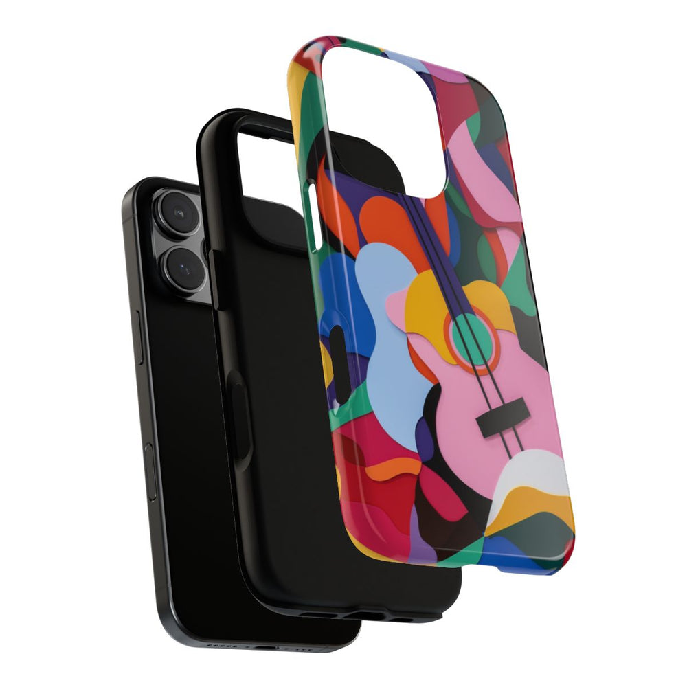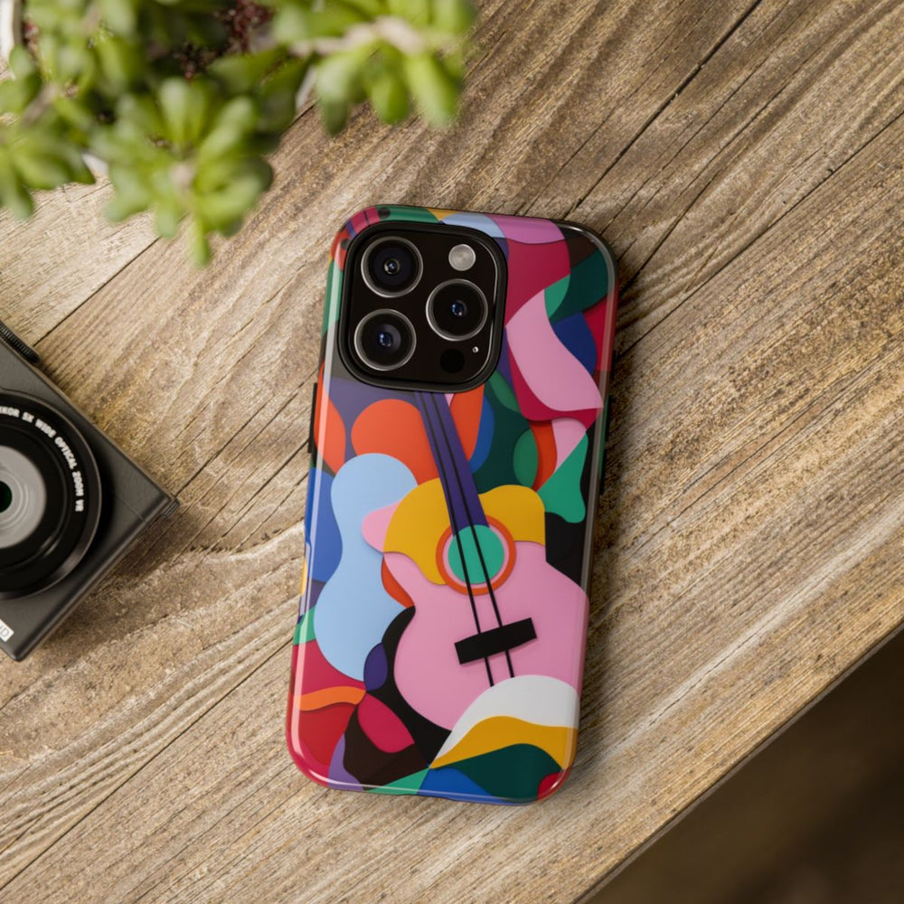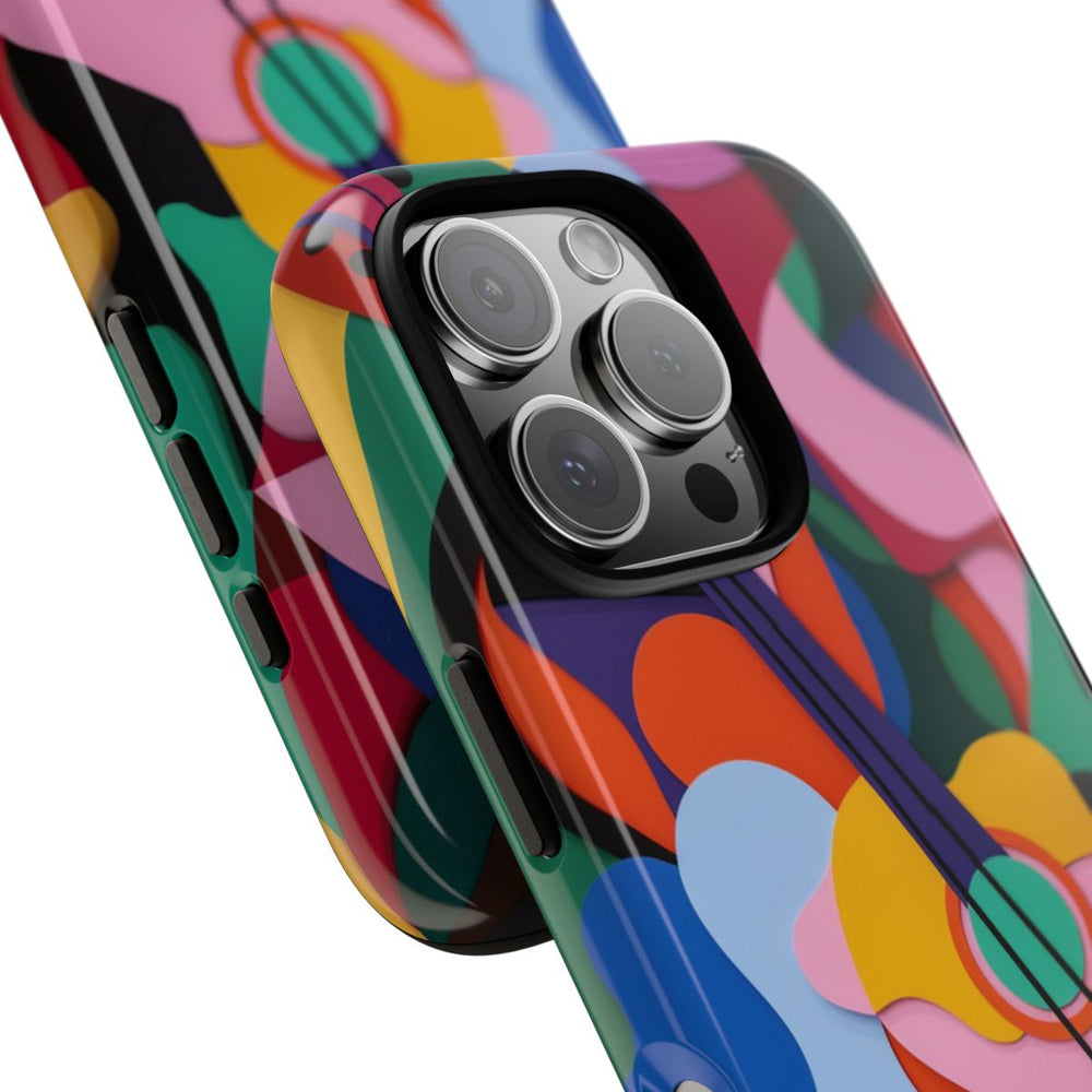 Dit hoesje is voorzien van een levendig abstract ontwerp met een gitaar als middelpunt. Felle, vlakke vormen in roze, geel, blauw, groen, rood en paars overlappen en vloeien in elkaar over, wat zorgt voor een speels en dynamisch geheel. De warme gele achtergrond laat de kleuren extra opvallen. Het hoesje bestaat uit twee lagen: een stevige polycarbonaat buitenkant en een TPU-binnenzijde. Dit zorgt voor extra bescherming en maakt het hoesje geschikt voor gebruik buitenshuis. Ondersteunt draadloos opladen.