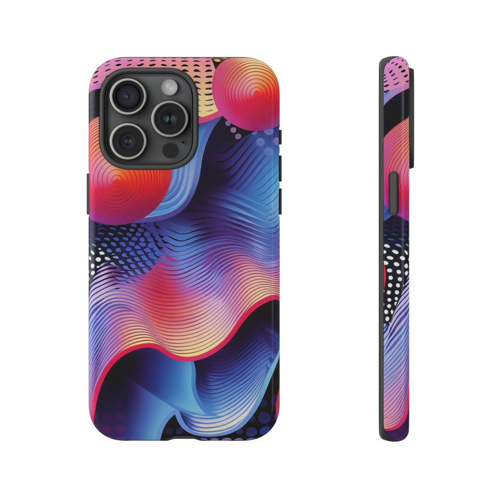 Dit hoesje heeft een opvallend ontwerp met levendige, golvende lijnen in blauw, paars, roze en geel. Boven de golvende achtergrond zweven vier fel oranje-rode bollen met concentrische cirkelpatronen. De achtergrond is verrijkt met gestippelde patronen in zwart, wit en paars, wat extra diepte en textuur geeft. De stijl is dynamisch en modern, met vloeiende kleurverlopen en verfijnde lijndetails. Het hoesje is glanzend afgewerkt, stevig uitgevoerd en ondersteunt draadloos opladen.