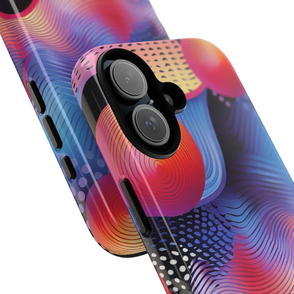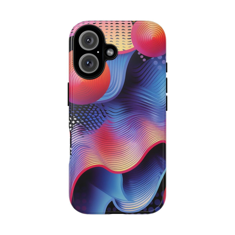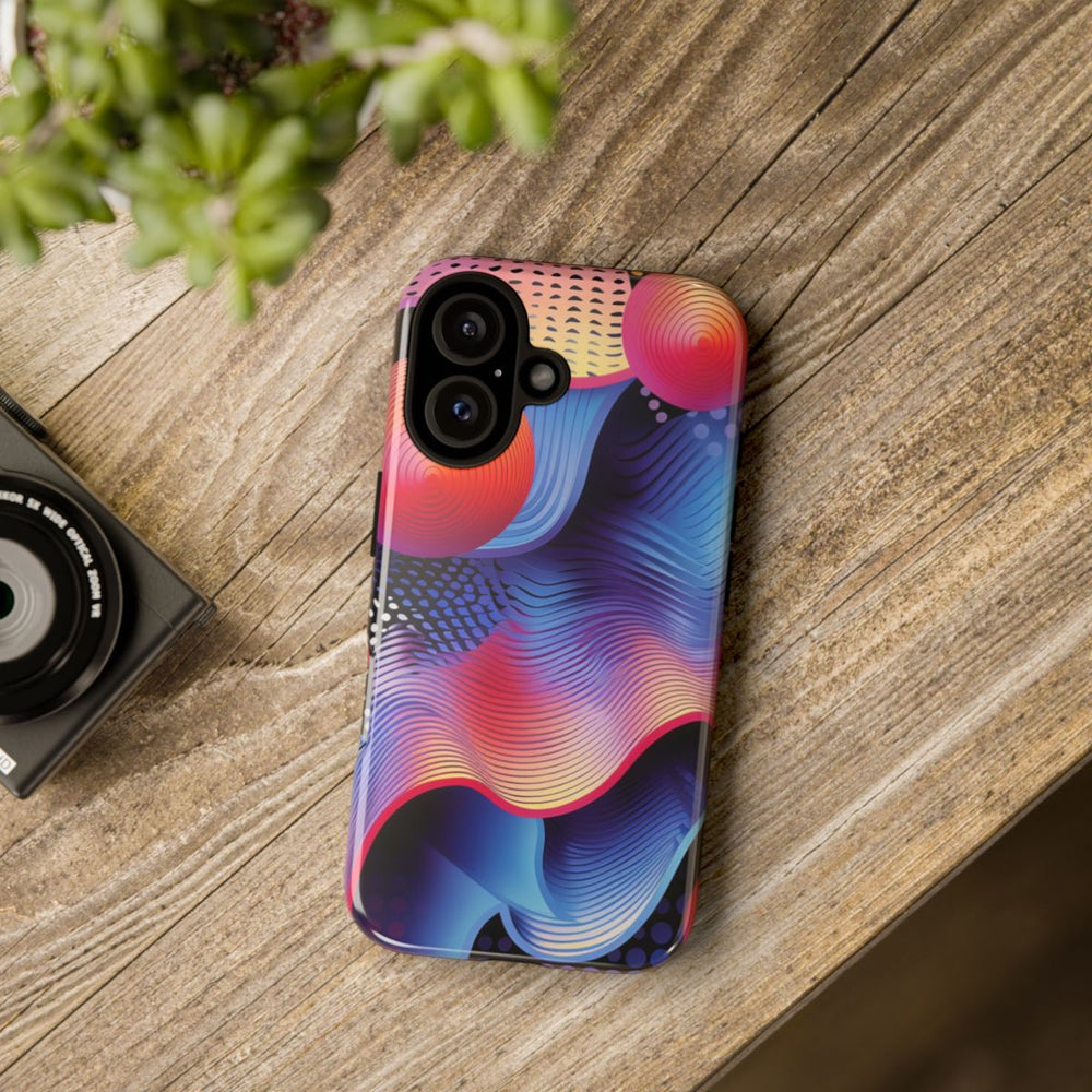 Dit hoesje heeft een opvallend ontwerp met levendige, golvende lijnen in blauw, paars, roze en geel. Boven de golvende achtergrond zweven vier fel oranje-rode bollen met concentrische cirkelpatronen. De achtergrond is verrijkt met gestippelde patronen in zwart, wit en paars, wat extra diepte en textuur geeft. De stijl is dynamisch en modern, met vloeiende kleurverlopen en verfijnde lijndetails. Het hoesje is glanzend afgewerkt, stevig uitgevoerd en ondersteunt draadloos opladen.