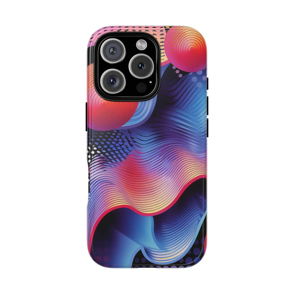 Dit hoesje heeft een opvallend ontwerp met levendige, golvende lijnen in blauw, paars, roze en geel. Boven de golvende achtergrond zweven vier fel oranje-rode bollen met concentrische cirkelpatronen. De achtergrond is verrijkt met gestippelde patronen in zwart, wit en paars, wat extra diepte en textuur geeft. De stijl is dynamisch en modern, met vloeiende kleurverlopen en verfijnde lijndetails. Het hoesje is glanzend afgewerkt, stevig uitgevoerd en ondersteunt draadloos opladen.