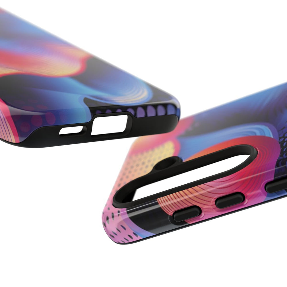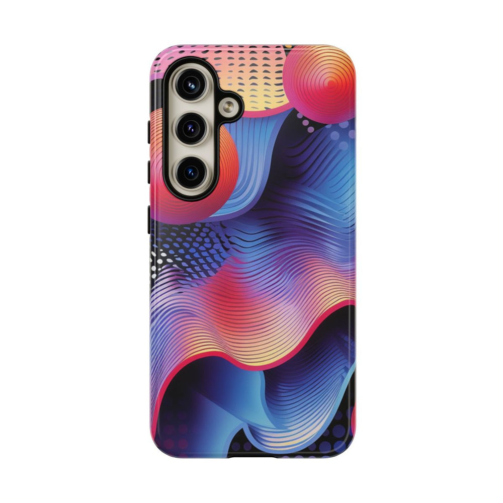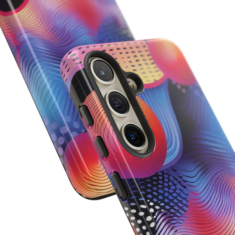 Dit hoesje heeft een opvallend ontwerp met levendige, golvende lijnen in blauw, paars, roze en geel. Boven de golvende achtergrond zweven vier fel oranje-rode bollen met concentrische cirkelpatronen. De achtergrond is verrijkt met gestippelde patronen in zwart, wit en paars, wat extra diepte en textuur geeft. De stijl is dynamisch en modern, met vloeiende kleurverlopen en verfijnde lijndetails. Het hoesje is glanzend afgewerkt, stevig uitgevoerd en ondersteunt draadloos opladen.