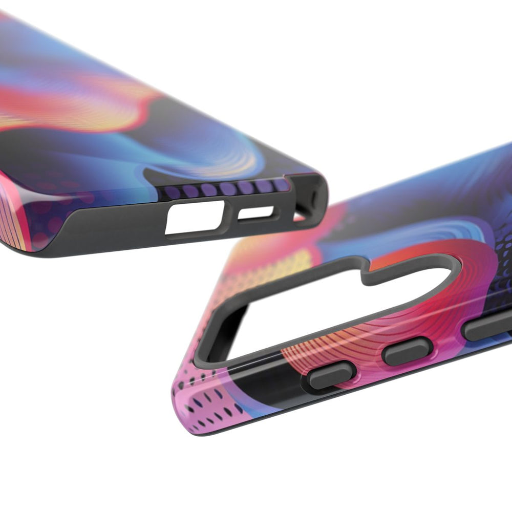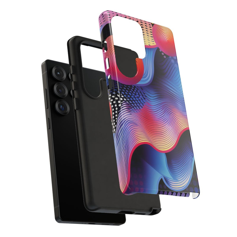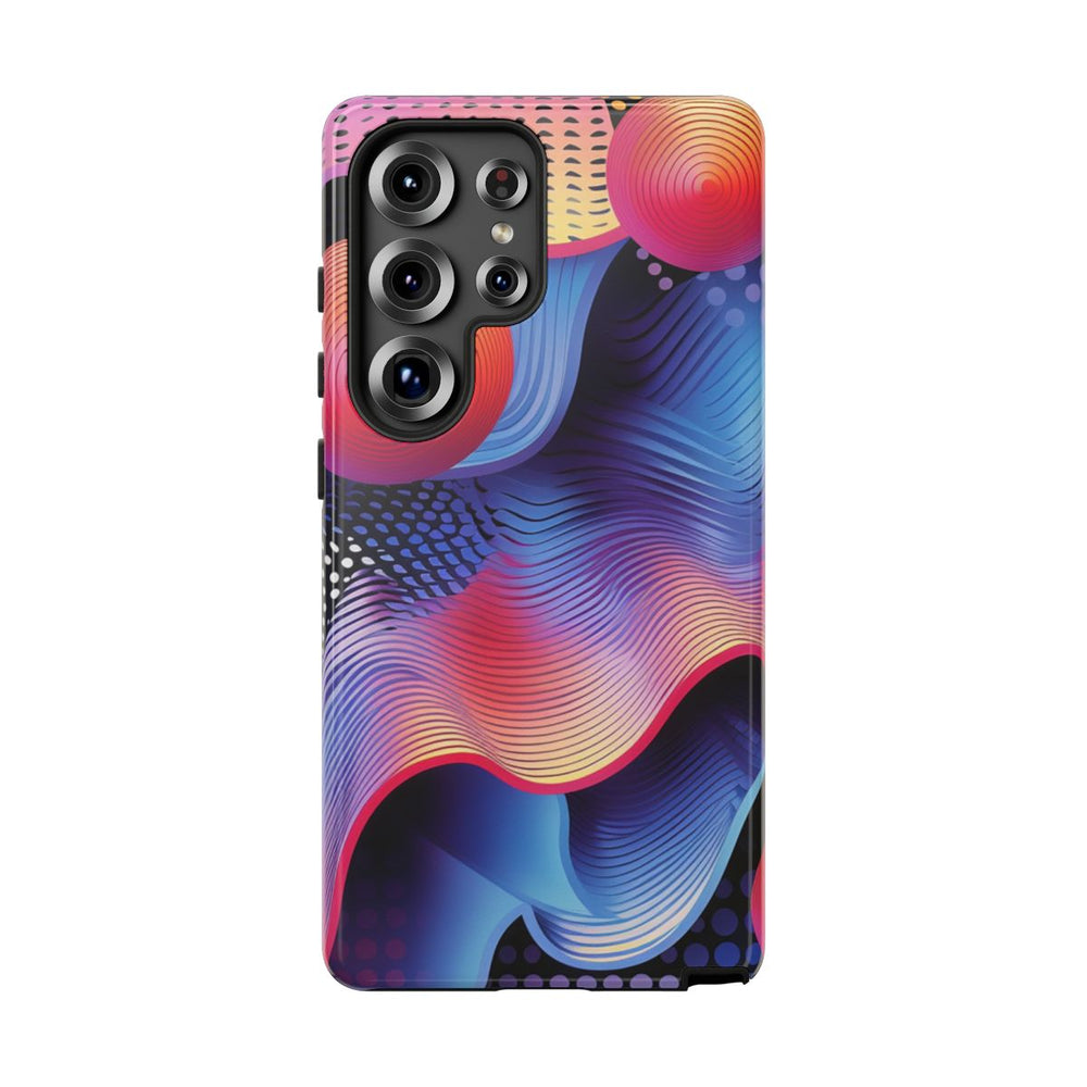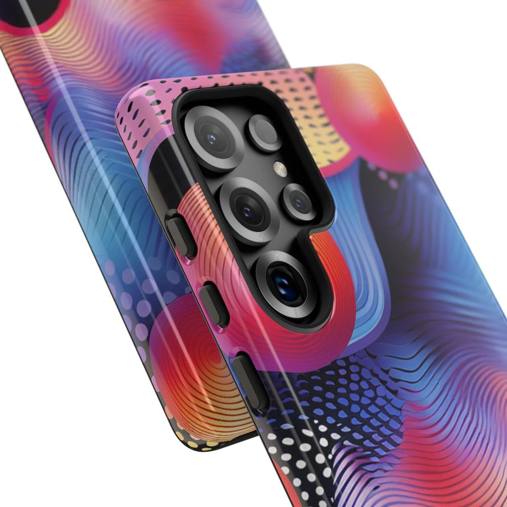 Dit hoesje heeft een opvallend ontwerp met levendige, golvende lijnen in blauw, paars, roze en geel. Boven de golvende achtergrond zweven vier fel oranje-rode bollen met concentrische cirkelpatronen. De achtergrond is verrijkt met gestippelde patronen in zwart, wit en paars, wat extra diepte en textuur geeft. De stijl is dynamisch en modern, met vloeiende kleurverlopen en verfijnde lijndetails. Het hoesje is glanzend afgewerkt, stevig uitgevoerd en ondersteunt draadloos opladen.