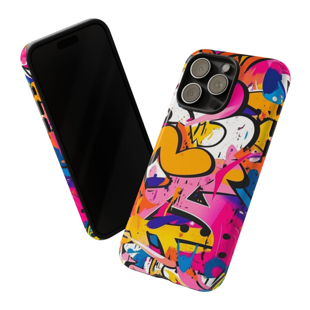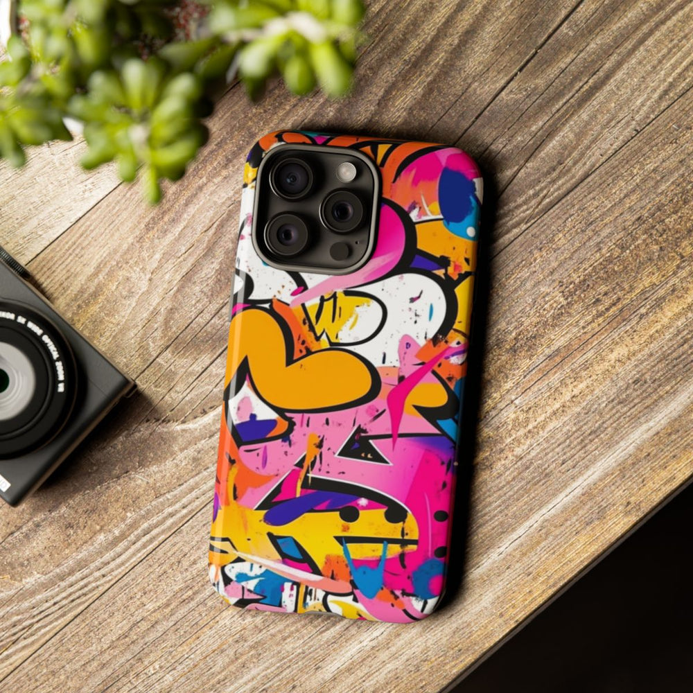 Dit telefoonhoesje heeft een opvallend graffiti-ontwerp met een mix van felle kleuren zoals roze, geel, blauw, oranje en wit. Het patroon bestaat uit diverse abstracte vormen, spetters en wildstyle letters, omlijnd met zwart. De chaotische en energieke samenstelling zorgt voor een echte streetart-uitstraling. Het hoesje is glanzend en stevig, gemaakt van een polycarbonaat buitenkant met een TPU binnenzijde. Zo biedt het dubbele bescherming en ondersteunt het draadloos opladen. Het ontwerp is visueel indrukwekkend en bijzonder kleurrijk.