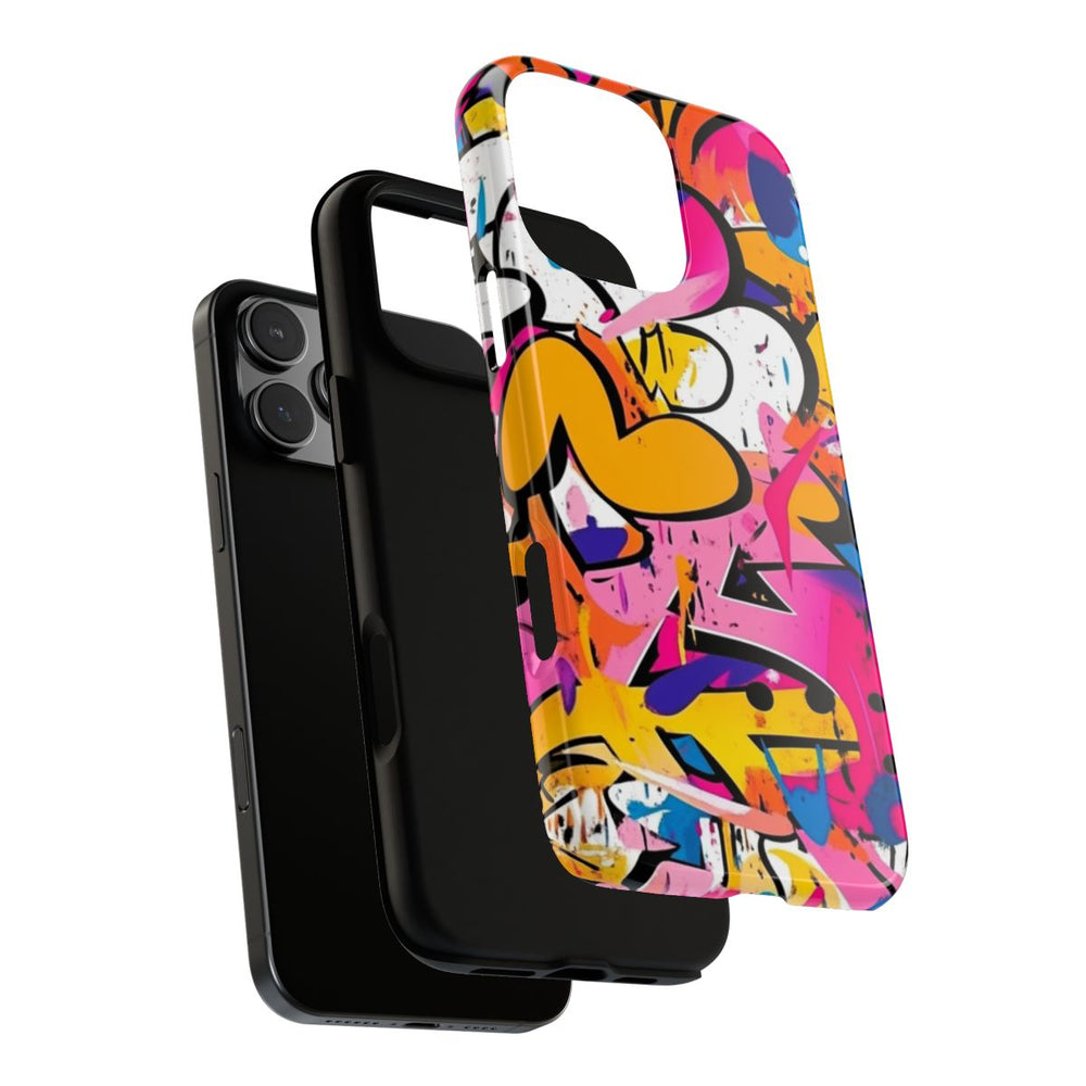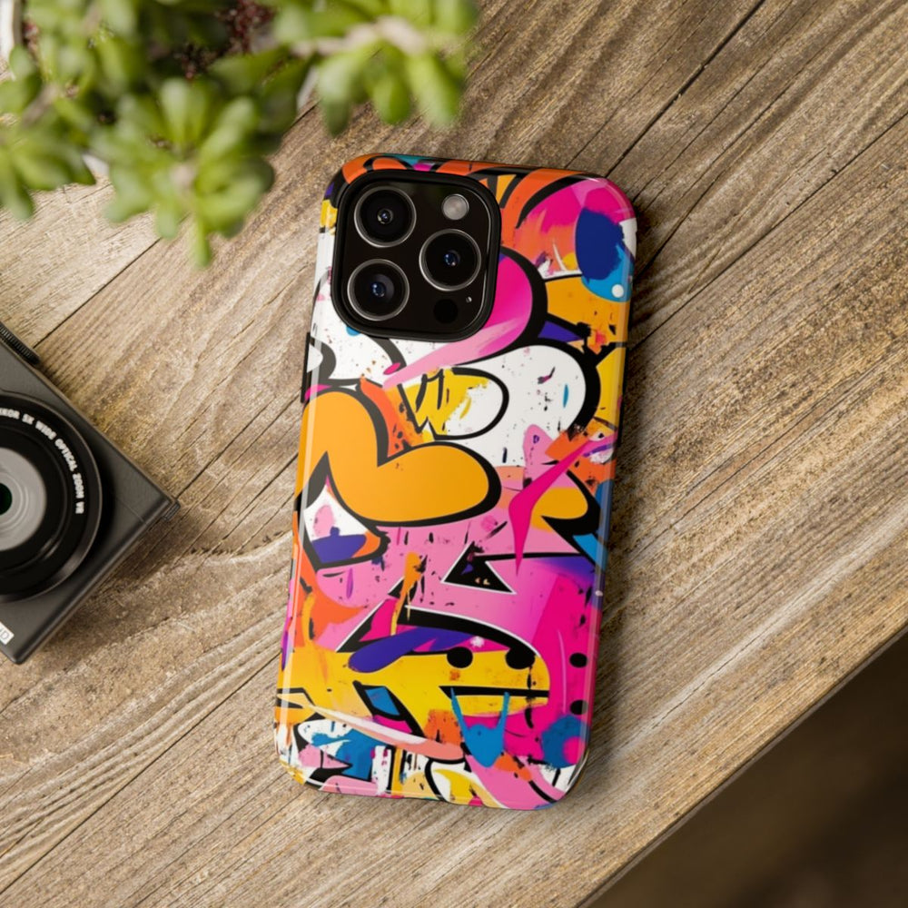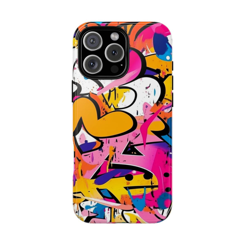 Dit telefoonhoesje heeft een opvallend graffiti-ontwerp met een mix van felle kleuren zoals roze, geel, blauw, oranje en wit. Het patroon bestaat uit diverse abstracte vormen, spetters en wildstyle letters, omlijnd met zwart. De chaotische en energieke samenstelling zorgt voor een echte streetart-uitstraling. Het hoesje is glanzend en stevig, gemaakt van een polycarbonaat buitenkant met een TPU binnenzijde. Zo biedt het dubbele bescherming en ondersteunt het draadloos opladen. Het ontwerp is visueel indrukwekkend en bijzonder kleurrijk.