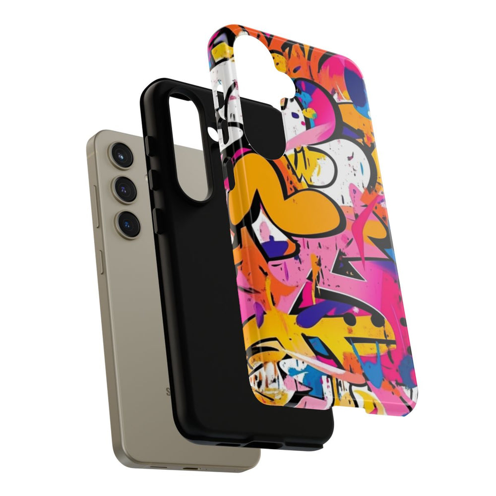 Dit telefoonhoesje heeft een opvallend graffiti-ontwerp met een mix van felle kleuren zoals roze, geel, blauw, oranje en wit. Het patroon bestaat uit diverse abstracte vormen, spetters en wildstyle letters, omlijnd met zwart. De chaotische en energieke samenstelling zorgt voor een echte streetart-uitstraling. Het hoesje is glanzend en stevig, gemaakt van een polycarbonaat buitenkant met een TPU binnenzijde. Zo biedt het dubbele bescherming en ondersteunt het draadloos opladen. Het ontwerp is visueel indrukwekkend en bijzonder kleurrijk.