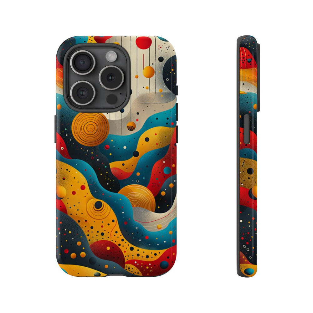 Dit hoesje heeft een abstract patroon met vloeiende golven en talloze ronde vormen die doen denken aan planeten of bollen. Het kleurgebruik bestaat uit levendige tinten rood, blauw, geel en zwart op een lichtbeige achtergrond. De compositie bevat gestippelde texturen en fijne lijnen die sommige bollen met elkaar verbinden, wat zorgt voor een dynamische en kosmische uitstraling. Het glanzende, stevige hoesje is gemaakt van een duurzame dubbele laag polycarbonaat en TPU voor extra bescherming en is geschikt voor draadloos opladen.
